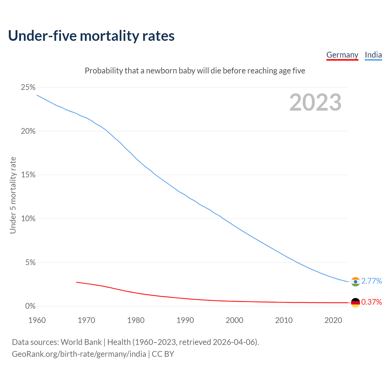 The chance that a newborn baby will die before reaching age five is 0.37% in Germany and 2.77% in India. Above is a chart with historical data on under-five mortality rates.
