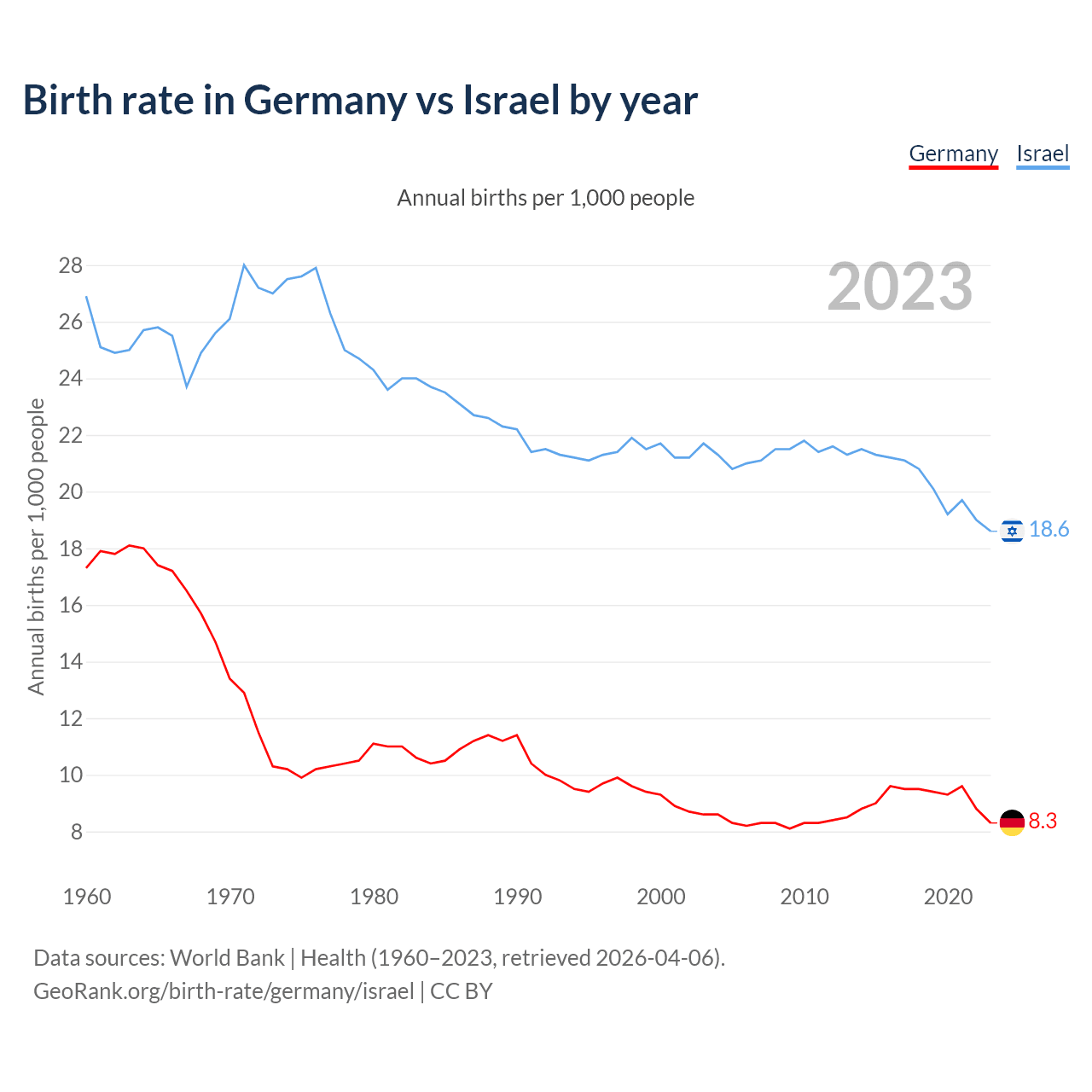 Germany has an annual birth rate of 8.3 births per 1,000 people, compared to 18.6 for Israel. The average number of children a woman is expected to have during her lifetime — the fertility rate, is 1.39 in Germany and 2.85 in Israel — 105% difference.