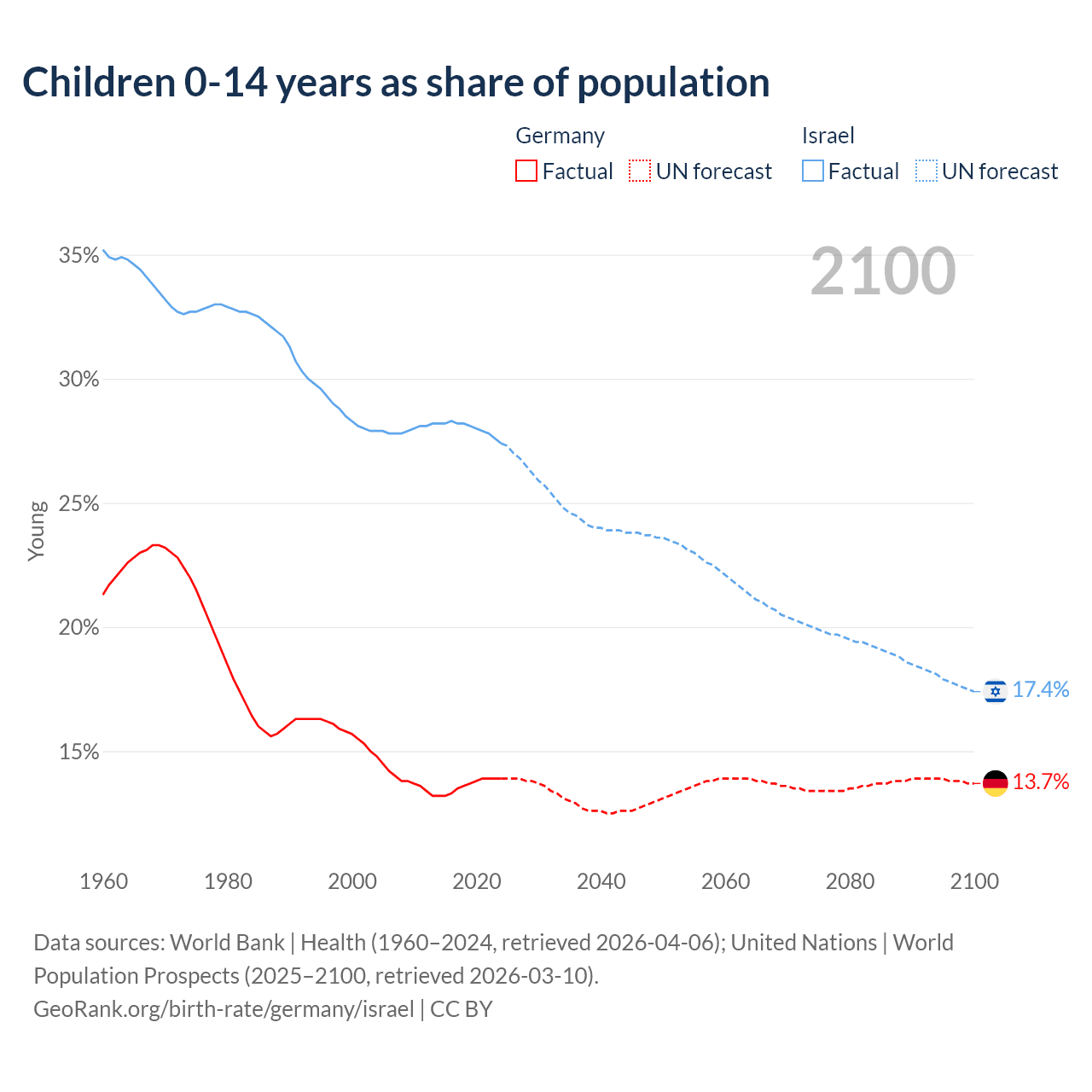 According to the latest available data on birth rates, the fertility rate in Germany was 1.39 children per woman in 2023, compared to 2.85 in Israel in 2023. The replacement level is considered to be 2.1 children per woman.