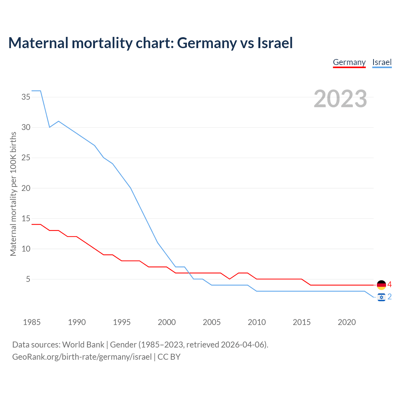The maternal mortality rate, which is the probability of dying during childbirth or within 42 days of pregnancy termination, is 4 deaths per 100,000 live births in Germany, compared to 2 deaths in Israel.