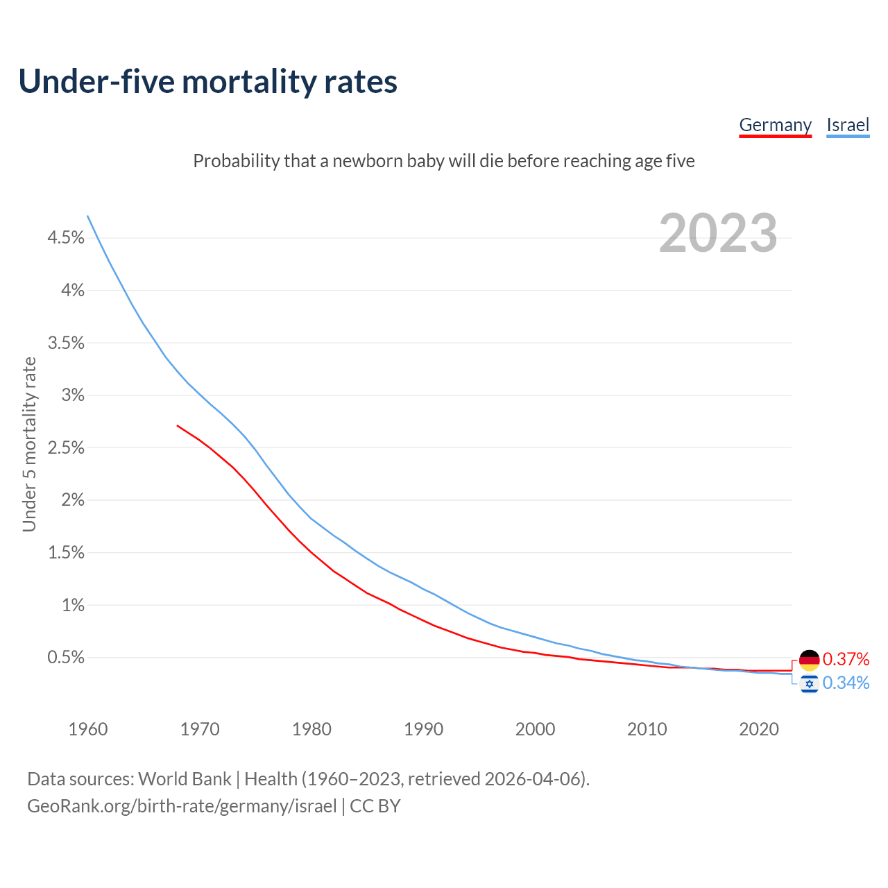 The chance that a newborn baby will die before reaching age five is 0.37% in Germany and 0.34% in Israel. Above is a chart with historical data on under-five mortality rates.