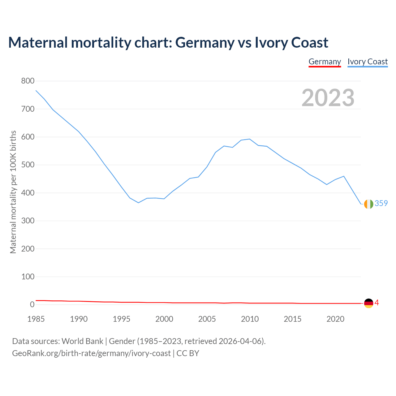 The maternal mortality rate, which is the probability of dying during childbirth or within 42 days of pregnancy termination, is 4 deaths per 100,000 live births in Germany, compared to 359 deaths in Ivory Coast.