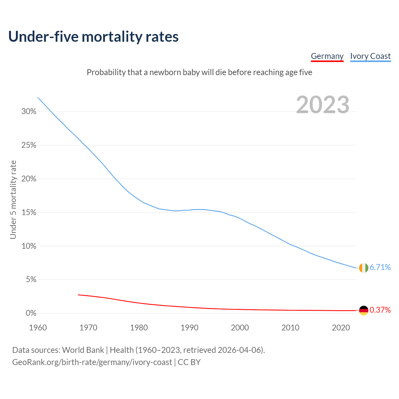 The chance that a newborn baby will die before reaching age five is 0.37% in Germany and 6.71% in Ivory Coast. Above is a chart with historical data on under-five mortality rates.
