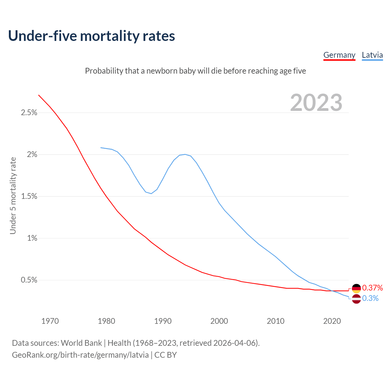 The chance that a newborn baby will die before reaching age five is 0.37% in Germany and 0.3% in Latvia. Above is a chart with historical data on under-five mortality rates.