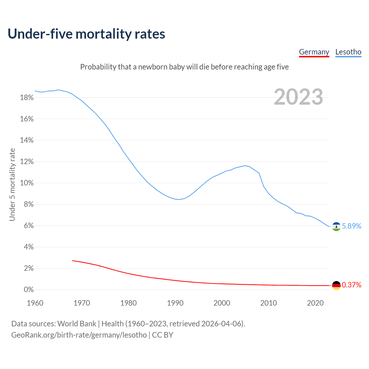 The chance that a newborn baby will die before reaching age five is 0.37% in Germany and 5.89% in Lesotho. Above is a chart with historical data on under-five mortality rates.