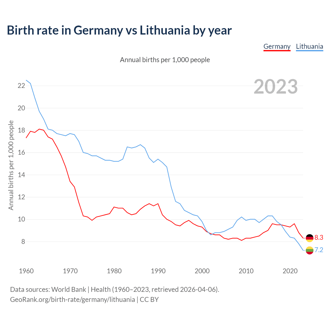 Germany has an annual birth rate of 8.3 births per 1,000 people, compared to 7.2 for Lithuania. The average number of children a woman is expected to have during her lifetime — the fertility rate, is 1.39 in Germany and 1.18 in Lithuania — 15.1% difference.