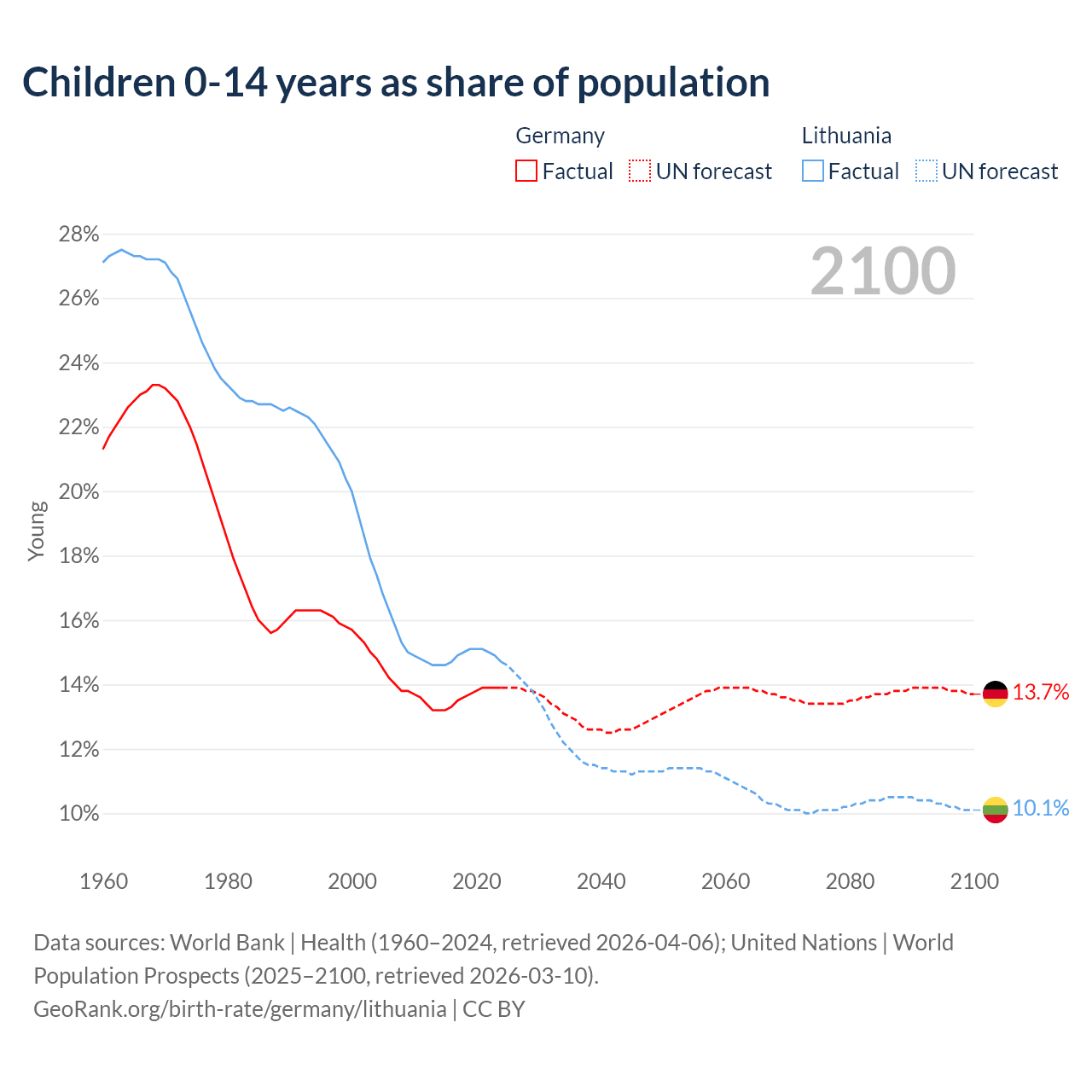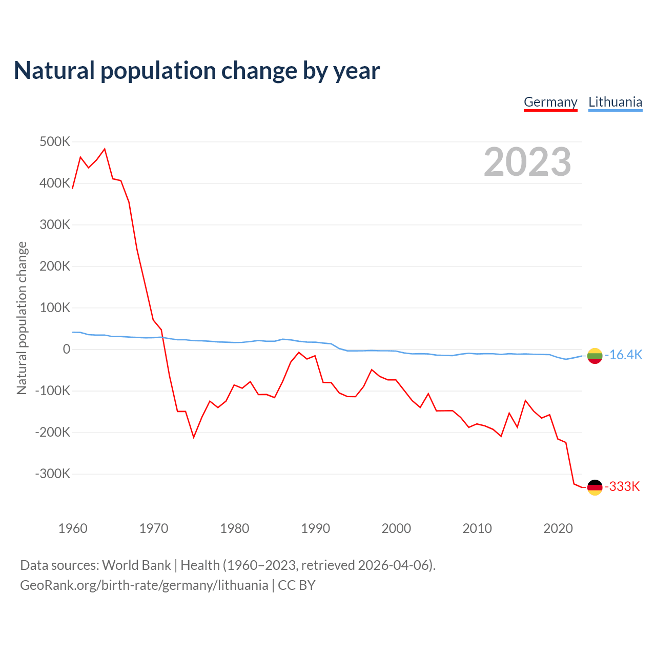 According to the latest available data on birth rates, the fertility rate in Germany was 1.39 children per woman in 2023, compared to 1.18 in Lithuania in 2023. The replacement level is considered to be 2.1 children per woman.