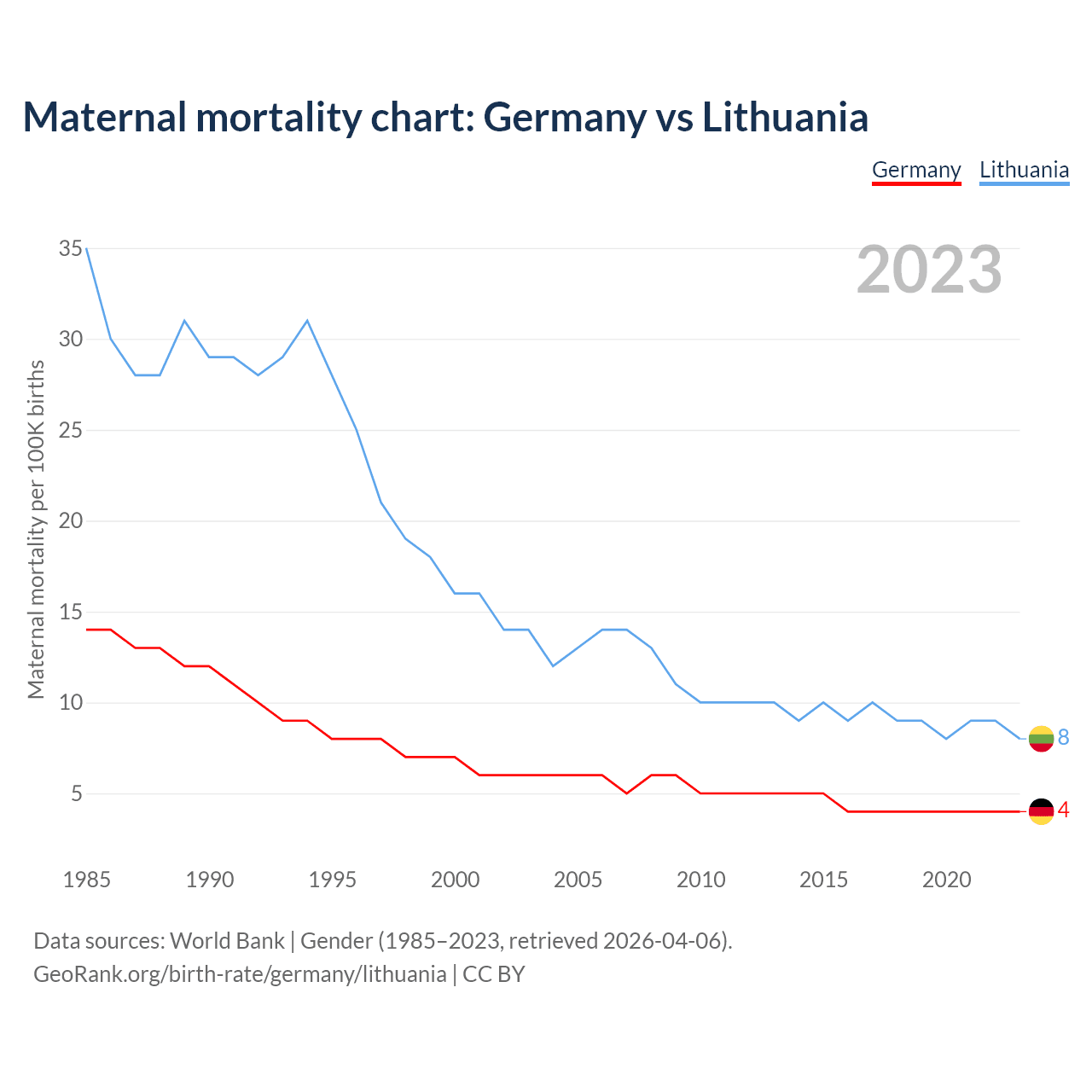 The maternal mortality rate, which is the probability of dying during childbirth or within 42 days of pregnancy termination, is 4 deaths per 100,000 live births in Germany, compared to 8 deaths in Lithuania.