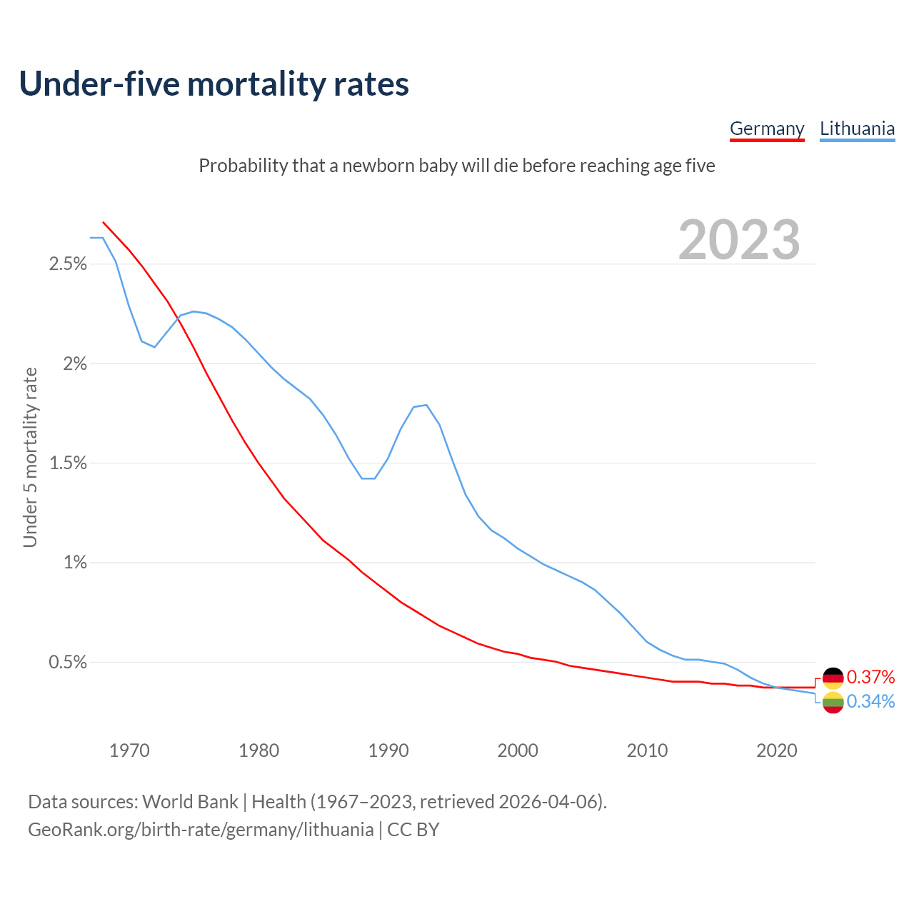 The chance that a newborn baby will die before reaching age five is 0.37% in Germany and 0.34% in Lithuania. Above is a chart with historical data on under-five mortality rates.