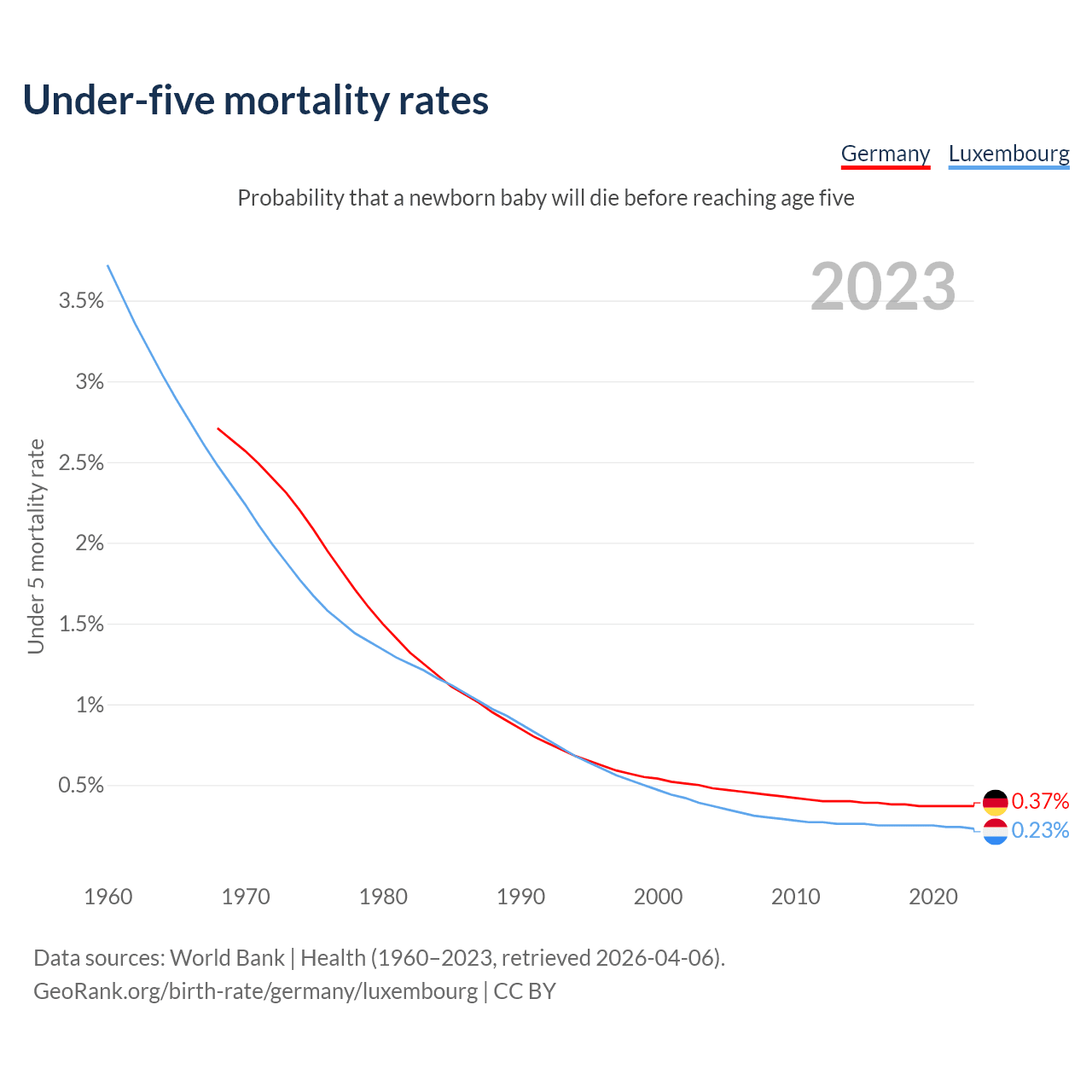 The chance that a newborn baby will die before reaching age five is 0.37% in Germany and 0.23% in Luxembourg. Above is a chart with historical data on under-five mortality rates.