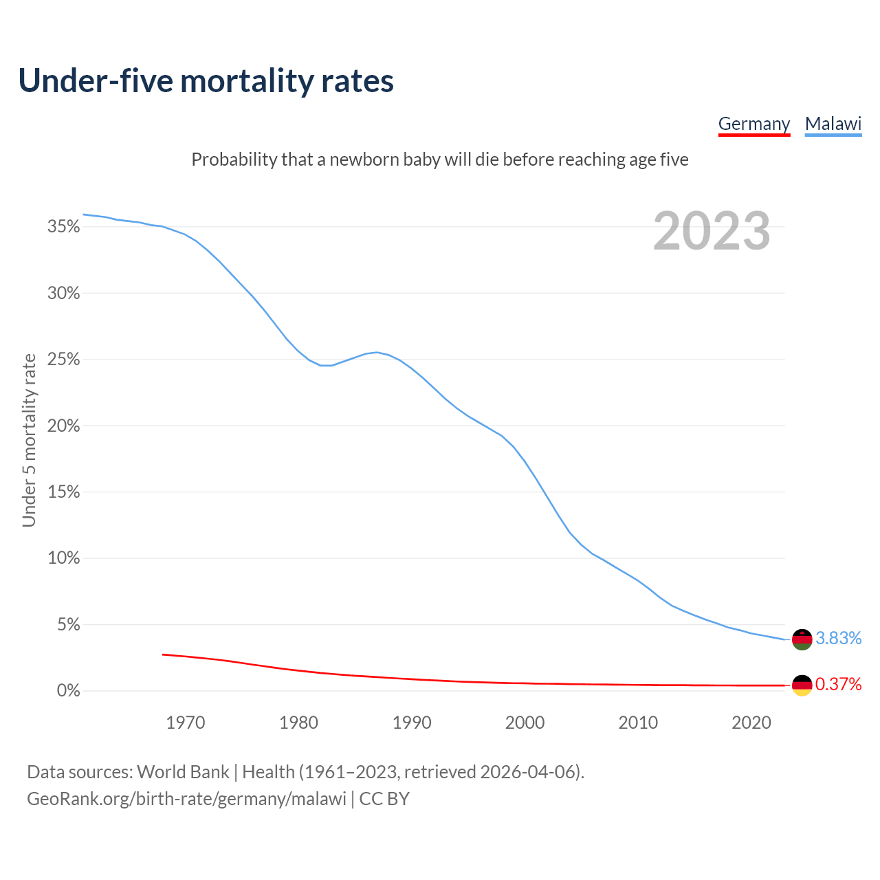 The chance that a newborn baby will die before reaching age five is 0.37% in Germany and 3.83% in Malawi. Above is a chart with historical data on under-five mortality rates.