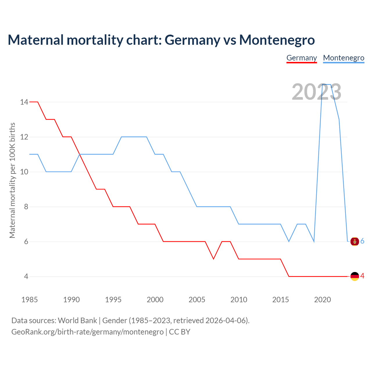 The maternal mortality rate, which is the probability of dying during childbirth or within 42 days of pregnancy termination, is 4 deaths per 100,000 live births in Germany, compared to 6 deaths in Montenegro.