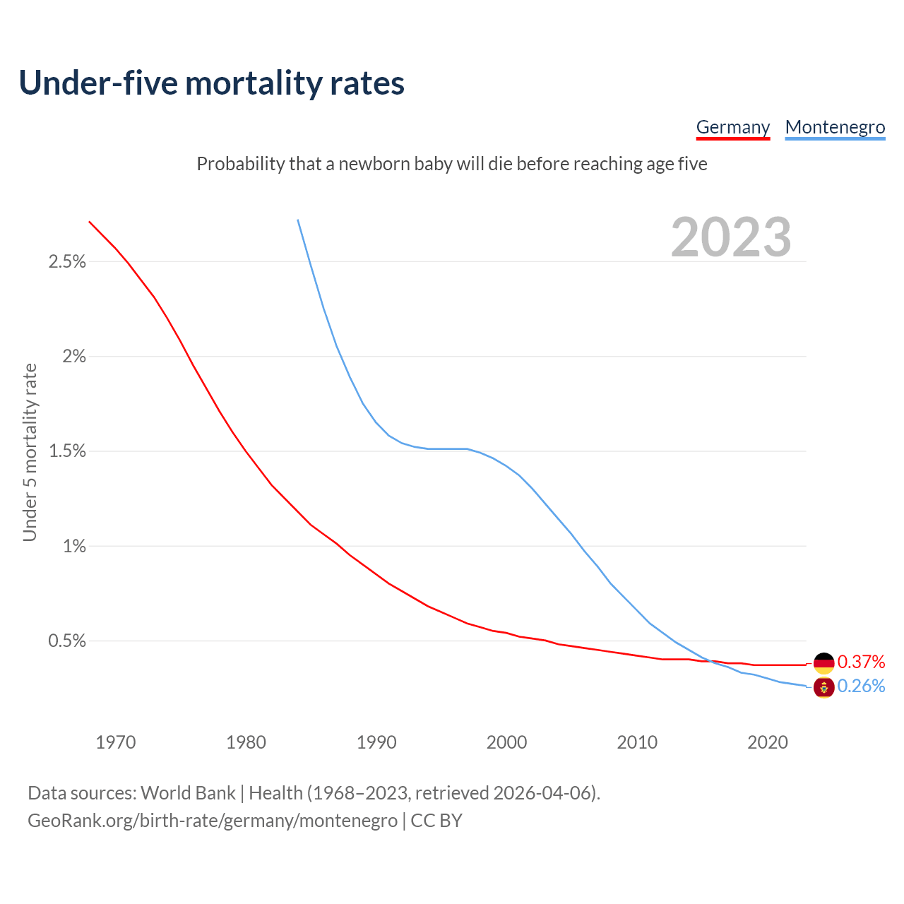 The chance that a newborn baby will die before reaching age five is 0.37% in Germany and 0.26% in Montenegro. Above is a chart with historical data on under-five mortality rates.
