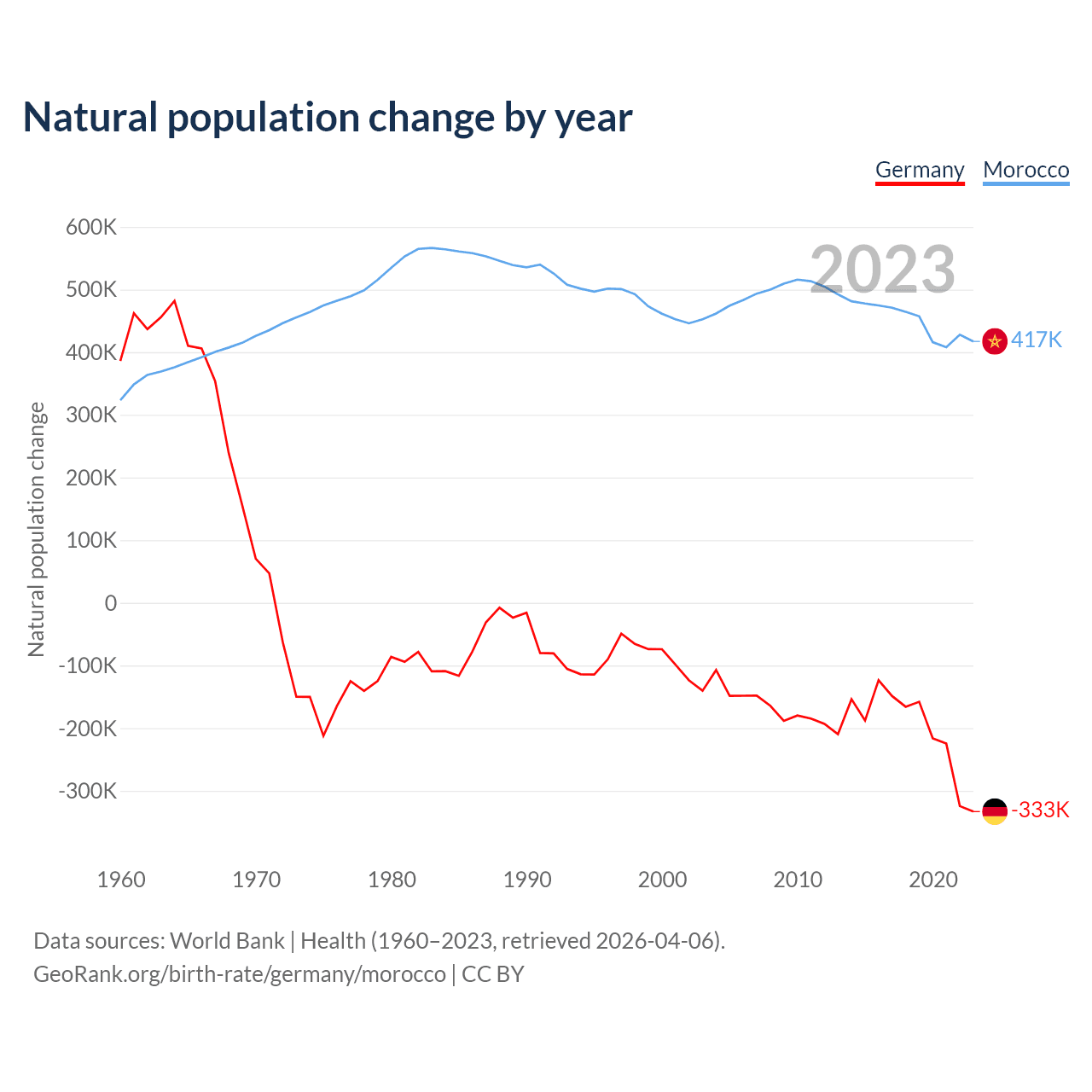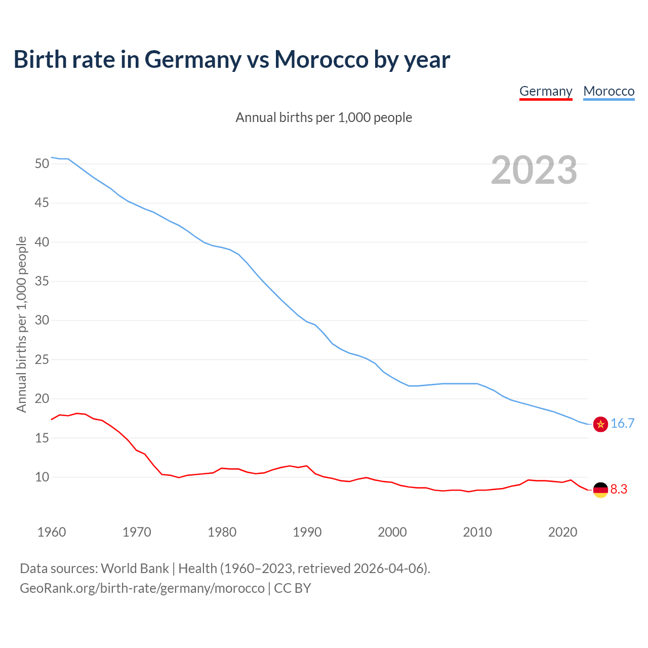Germany has an annual birth rate of 8.3 births per 1,000 people, compared to 16.7 for Morocco. The average number of children a woman is expected to have during her lifetime — the fertility rate, is 1.39 in Germany and 2.23 in Morocco — 60.4% difference.