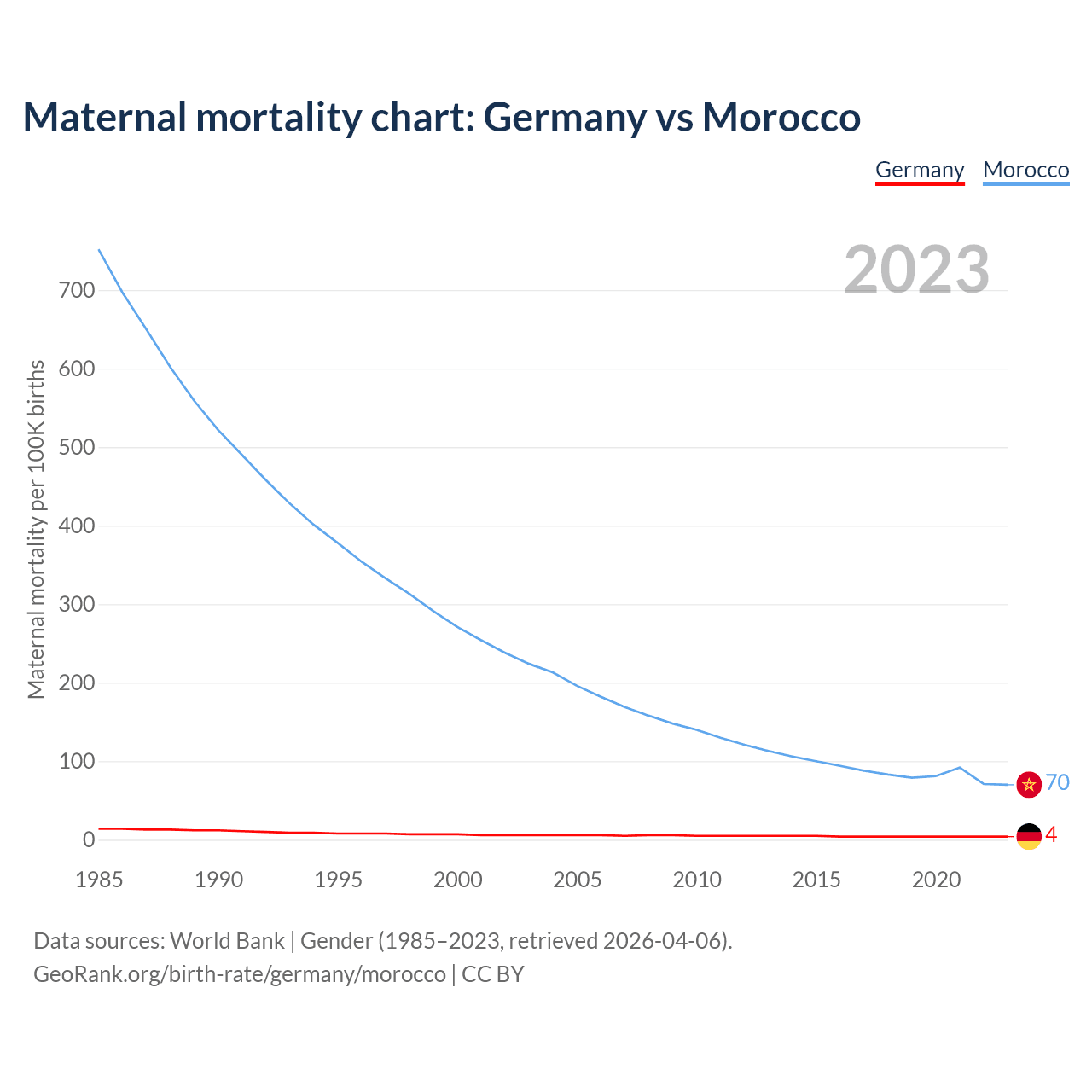 The maternal mortality rate, which is the probability of dying during childbirth or within 42 days of pregnancy termination, is 4 deaths per 100,000 live births in Germany, compared to 70 deaths in Morocco.