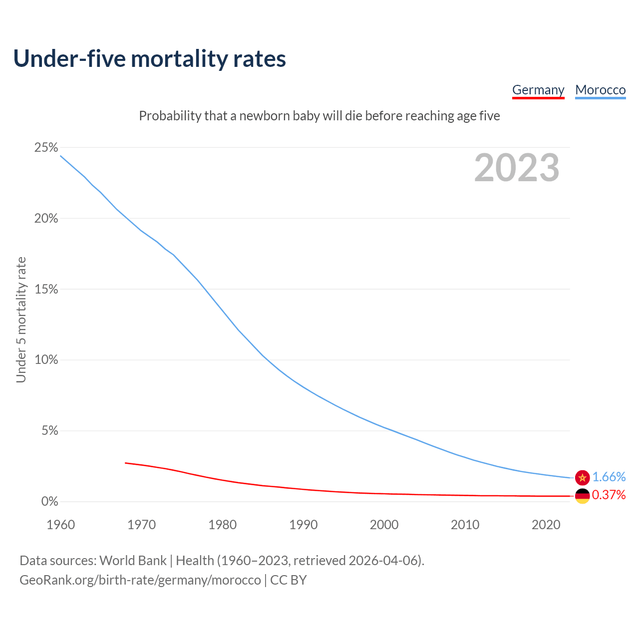 The chance that a newborn baby will die before reaching age five is 0.37% in Germany and 1.66% in Morocco. Above is a chart with historical data on under-five mortality rates.