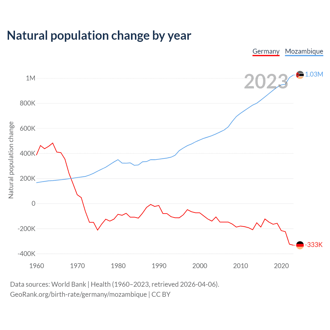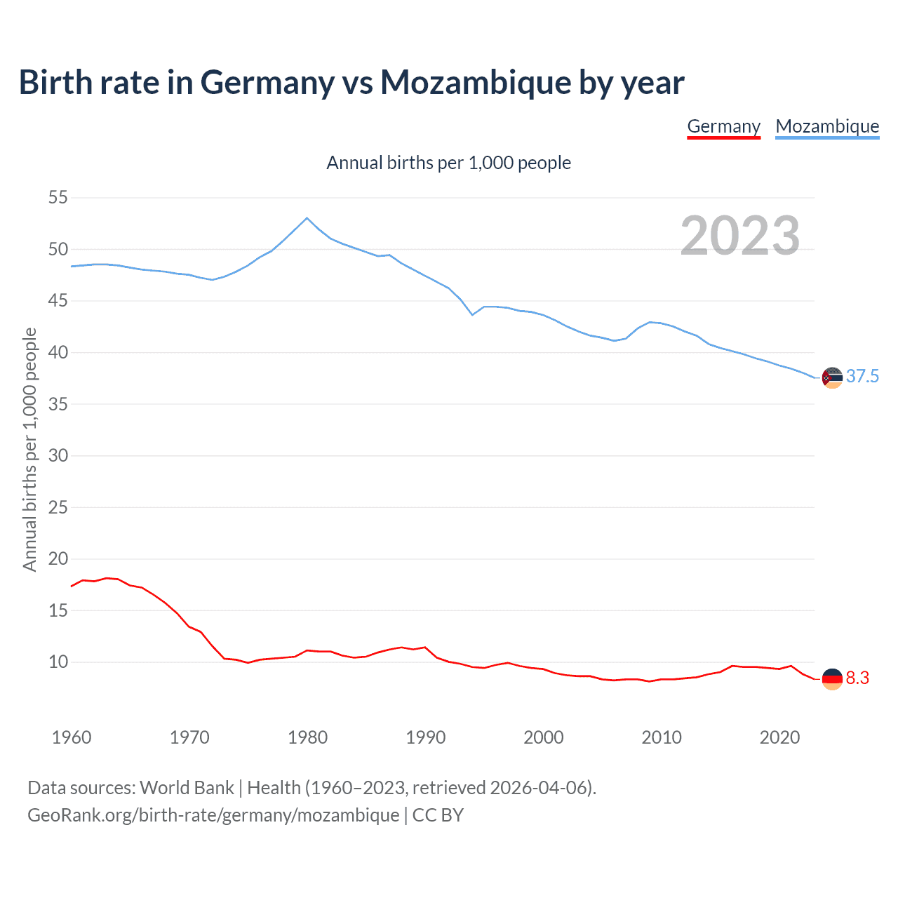 Germany has an annual birth rate of 8.3 births per 1,000 people, compared to 37.5 for Mozambique. The average number of children a woman is expected to have during her lifetime — the fertility rate, is 1.39 in Germany and 4.76 in Mozambique — 242.7% difference.