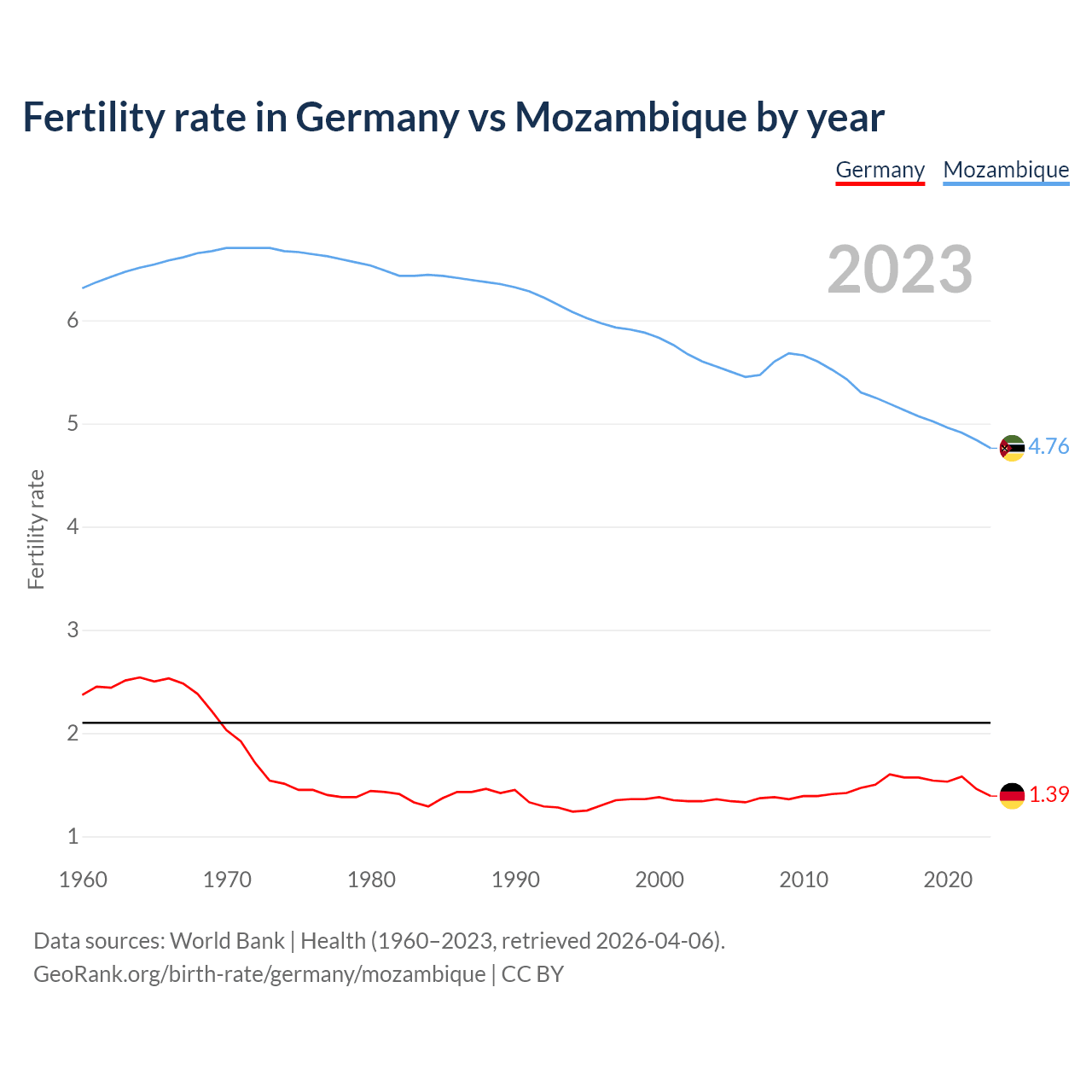 According to the latest available data on birth rates, the fertility rate in Germany was 1.39 children per woman in 2023, compared to 4.76 in Mozambique in 2023. The replacement level is considered to be 2.1 children per woman.