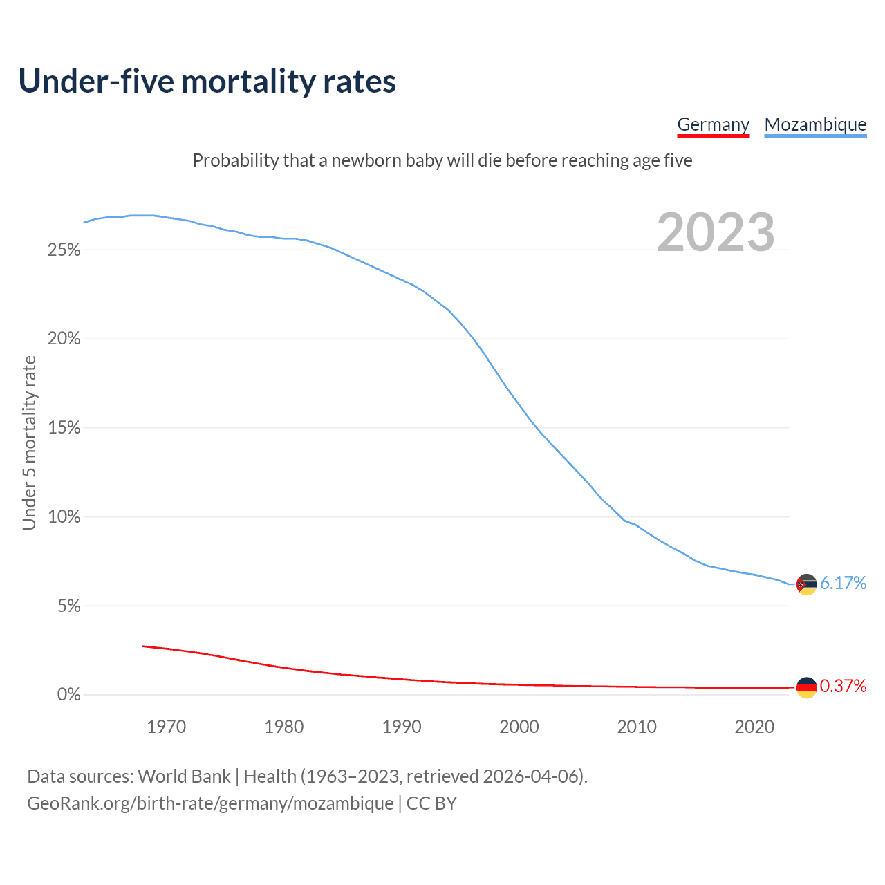 The chance that a newborn baby will die before reaching age five is 0.37% in Germany and 6.17% in Mozambique. Above is a chart with historical data on under-five mortality rates.