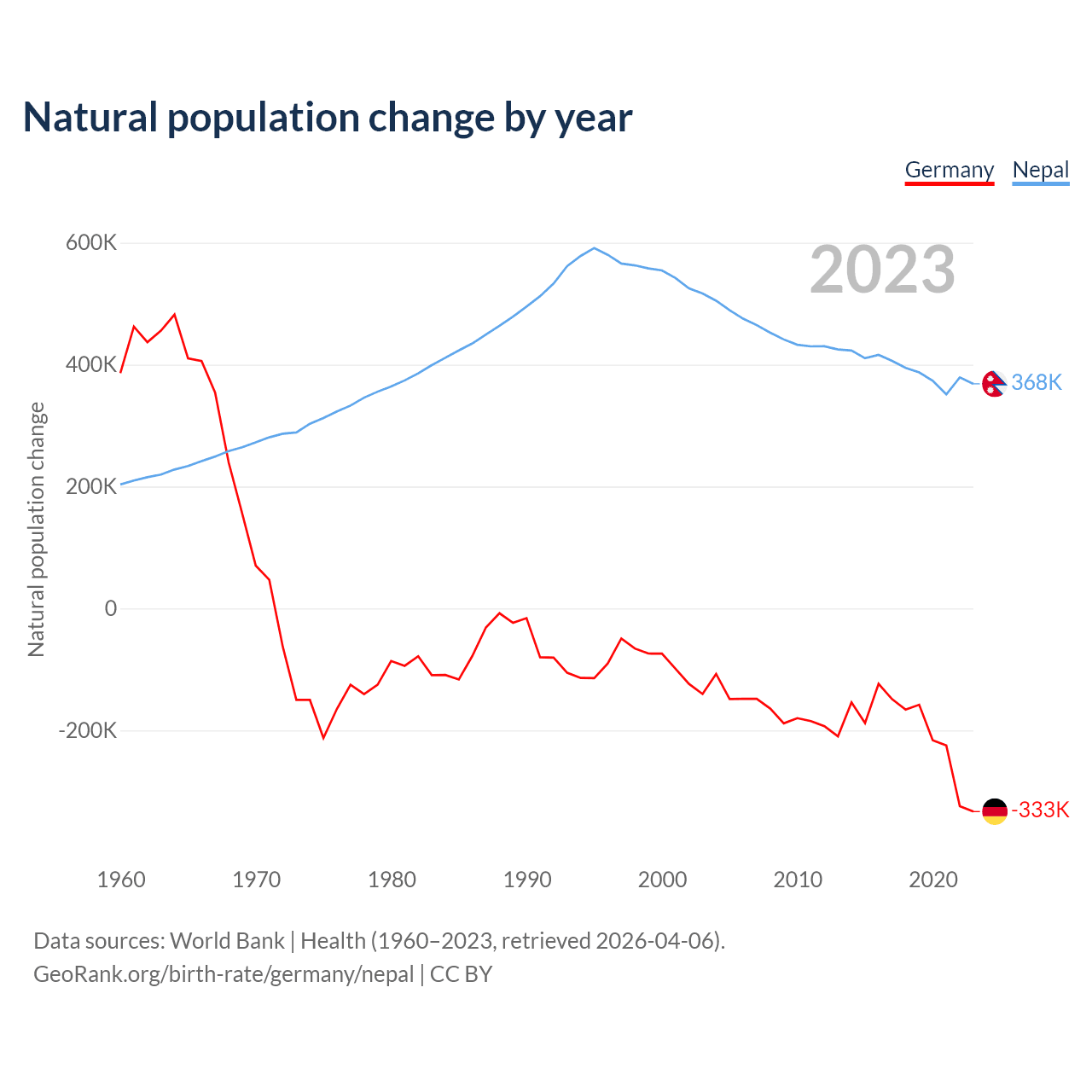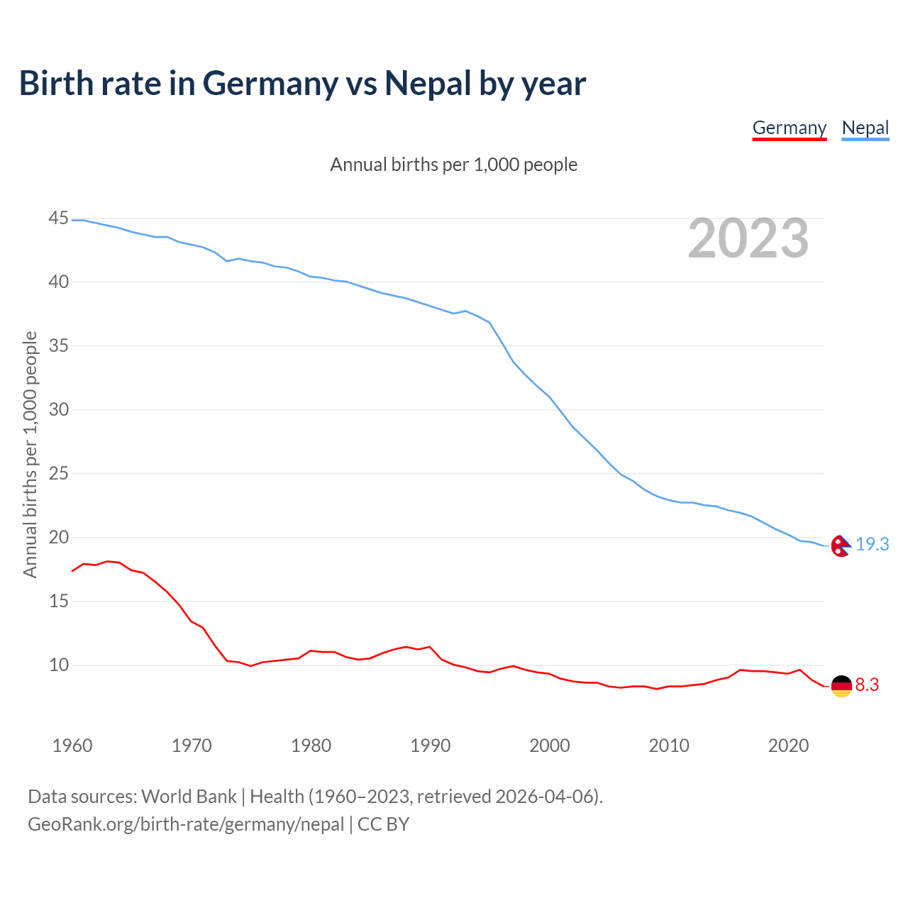 Germany has an annual birth rate of 8.3 births per 1,000 people, compared to 19.3 for Nepal. The average number of children a woman is expected to have during her lifetime — the fertility rate, is 1.39 in Germany and 1.98 in Nepal — 42.7% difference.