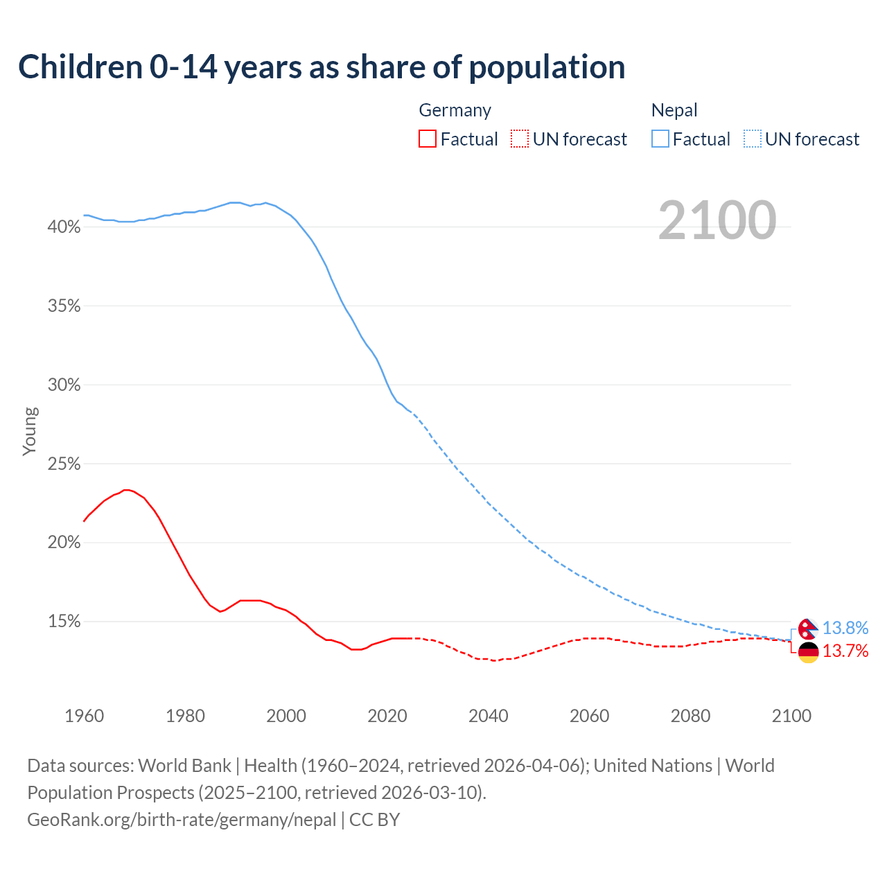 According to the latest available data on birth rates, the fertility rate in Germany was 1.39 children per woman in 2023, compared to 1.98 in Nepal in 2023. The replacement level is considered to be 2.1 children per woman.