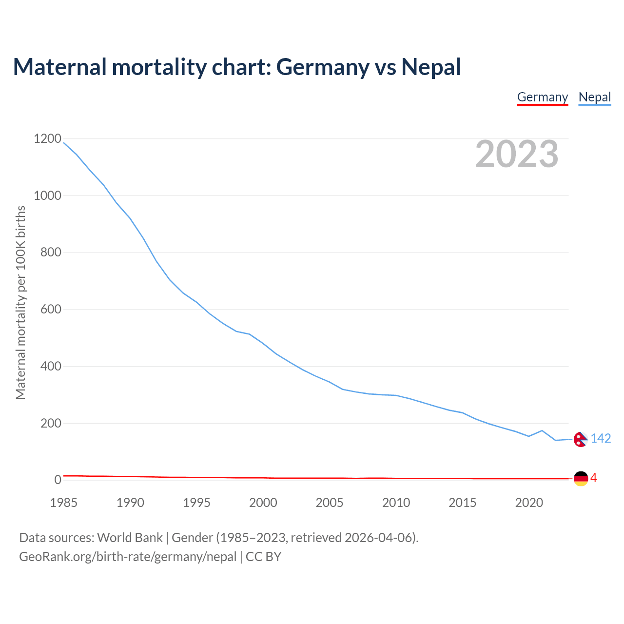 The maternal mortality rate, which is the probability of dying during childbirth or within 42 days of pregnancy termination, is 4 deaths per 100,000 live births in Germany, compared to 142 deaths in Nepal.