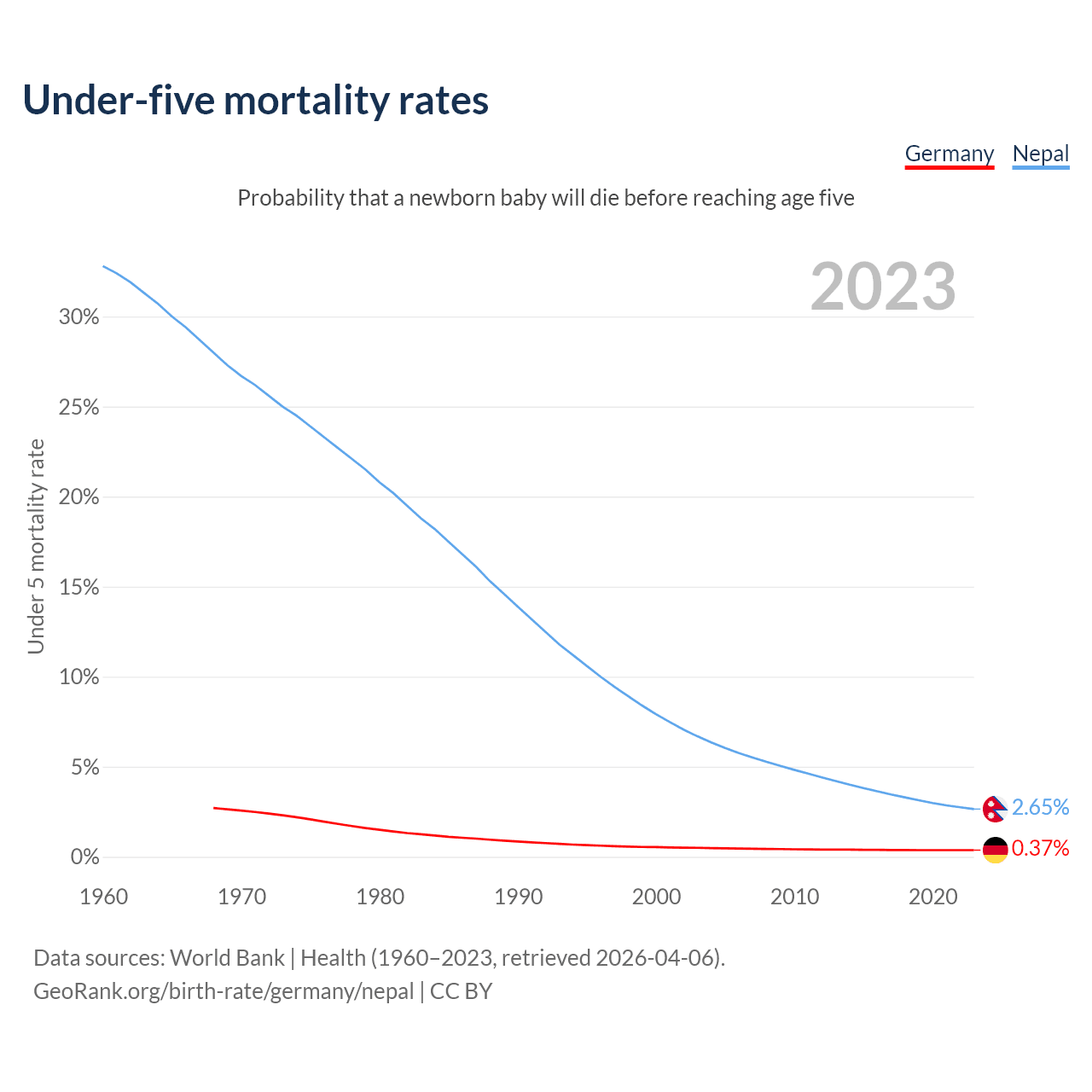 The chance that a newborn baby will die before reaching age five is 0.37% in Germany and 2.65% in Nepal. Above is a chart with historical data on under-five mortality rates.