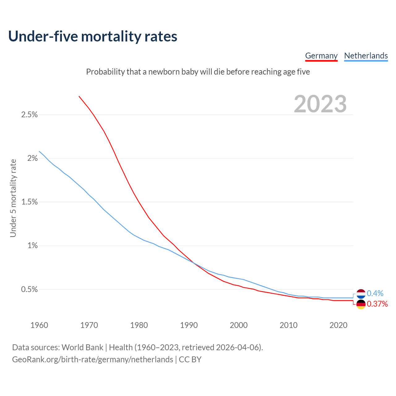 The chance that a newborn baby will die before reaching age five is 0.37% in Germany and 0.4% in the Netherlands. Above is a chart with historical data on under-five mortality rates.