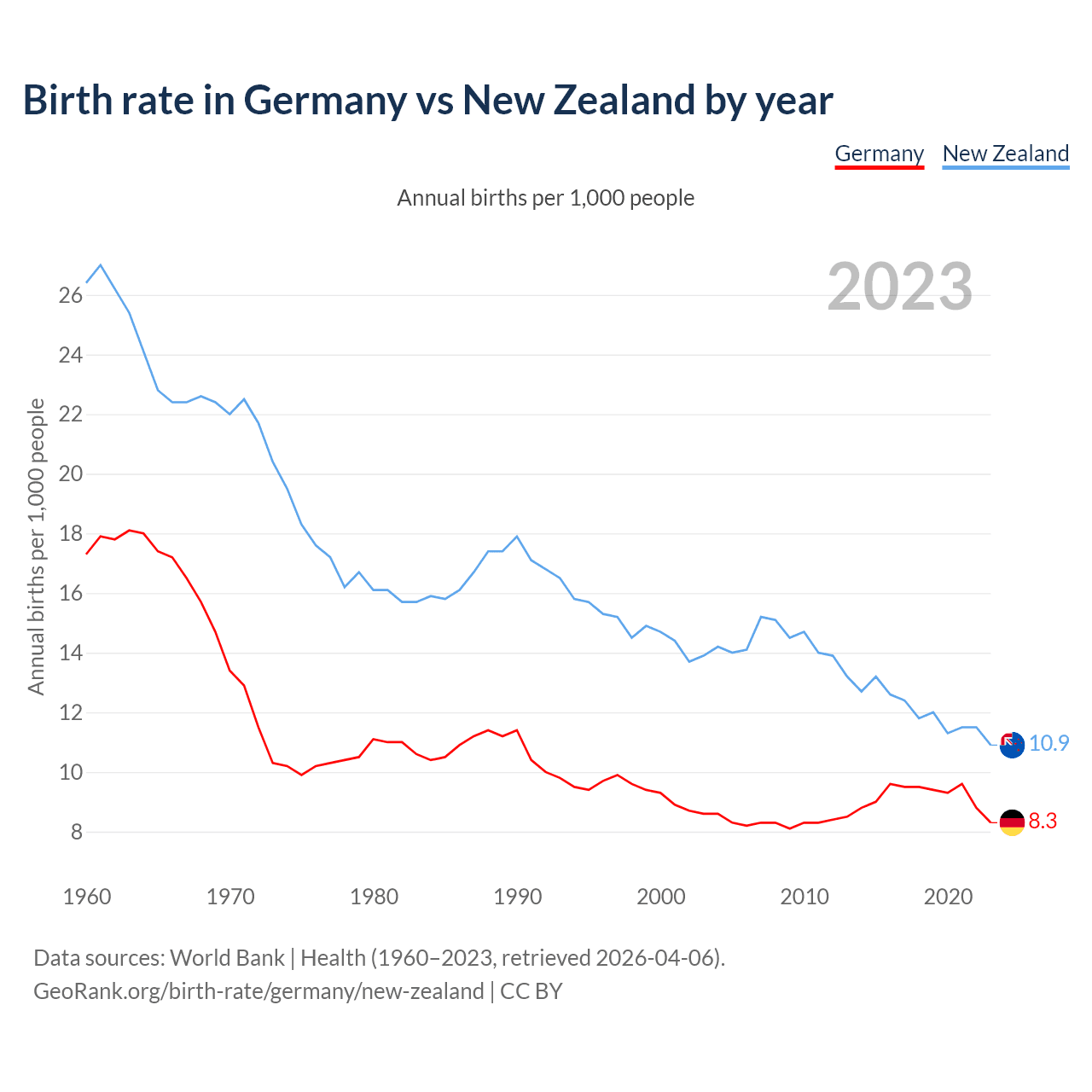 Germany has an annual birth rate of 8.3 births per 1,000 people, compared to 10.9 for New Zealand. The average number of children a woman is expected to have during her lifetime — the fertility rate, is 1.39 in Germany and 1.56 in New Zealand — 12.2% difference.