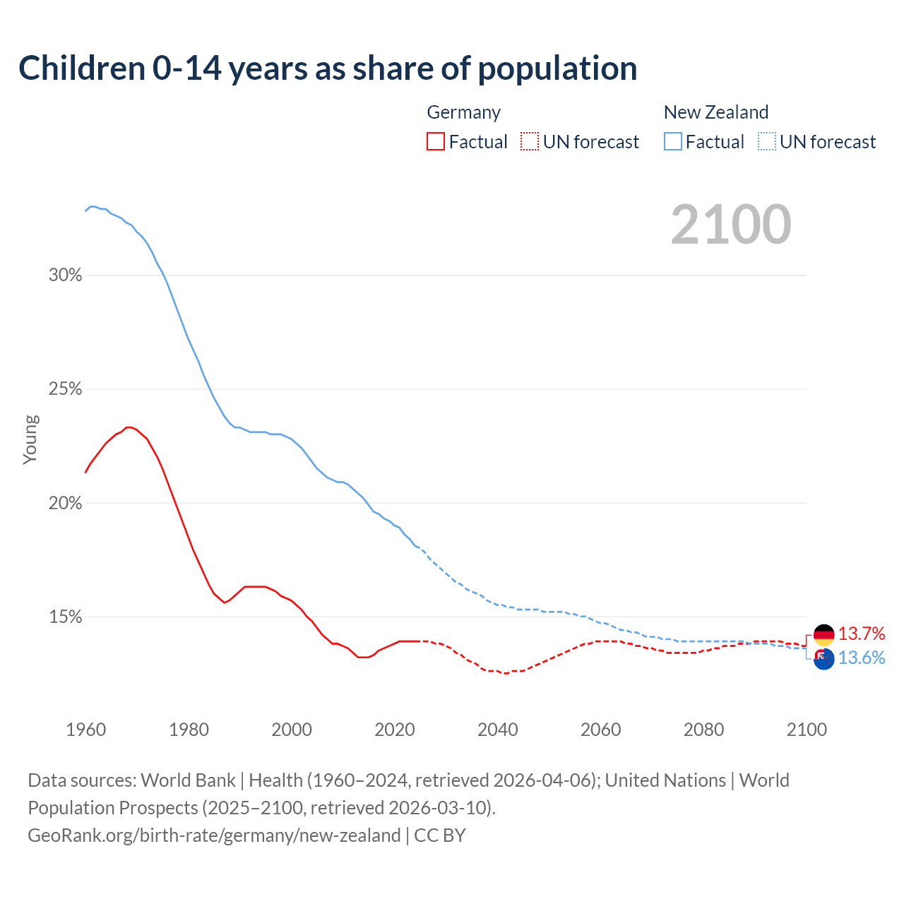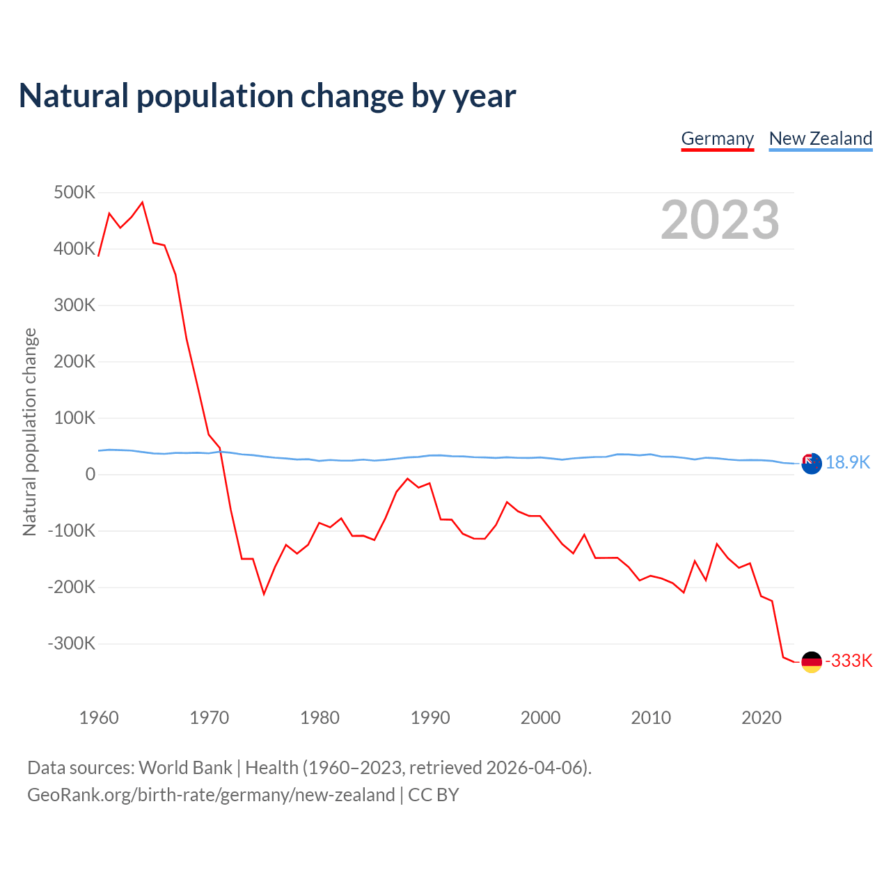 According to the latest available data on birth rates, the fertility rate in Germany was 1.39 children per woman in 2023, compared to 1.56 in New Zealand in 2023. The replacement level is considered to be 2.1 children per woman.