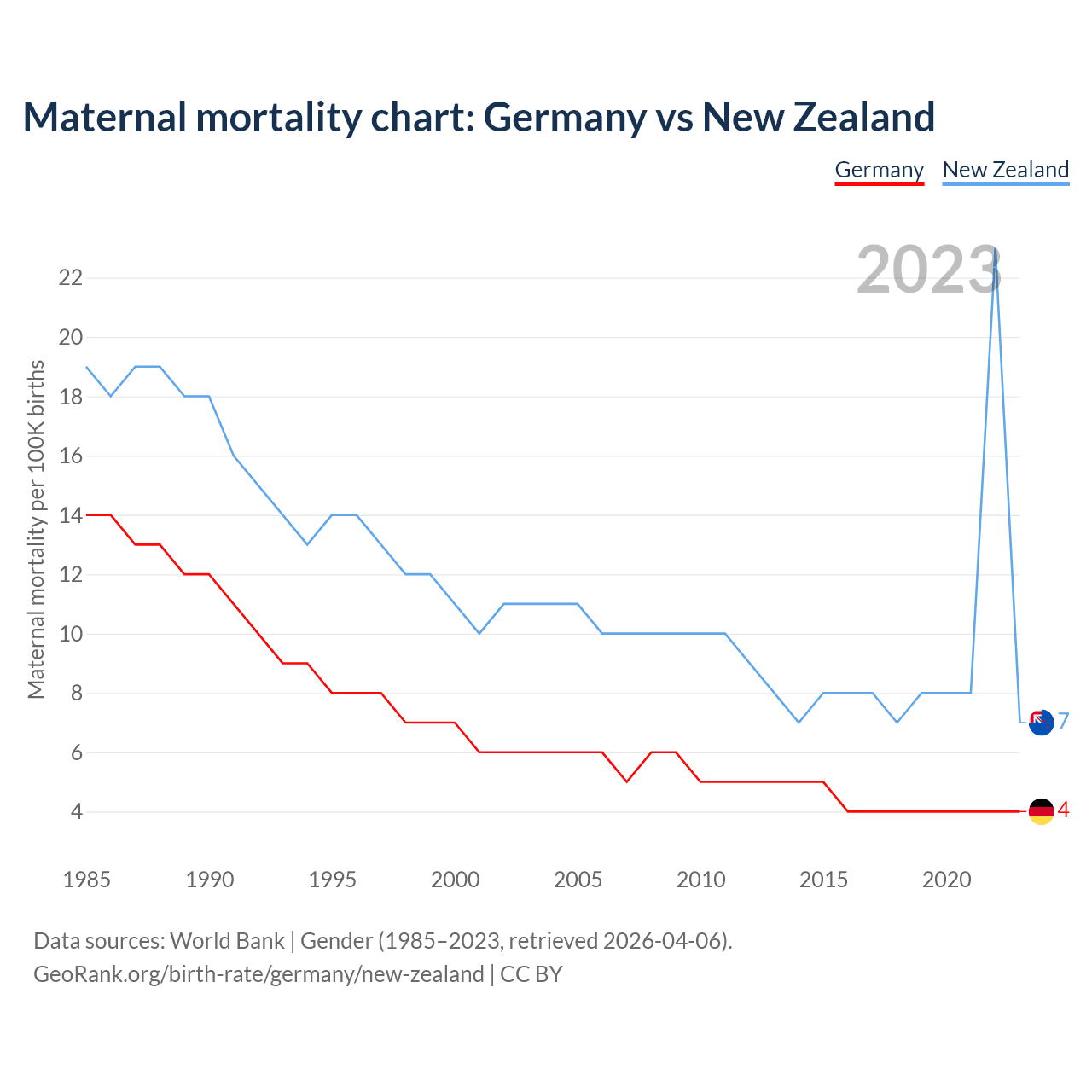 The maternal mortality rate, which is the probability of dying during childbirth or within 42 days of pregnancy termination, is 4 deaths per 100,000 live births in Germany, compared to 7 deaths in New Zealand.