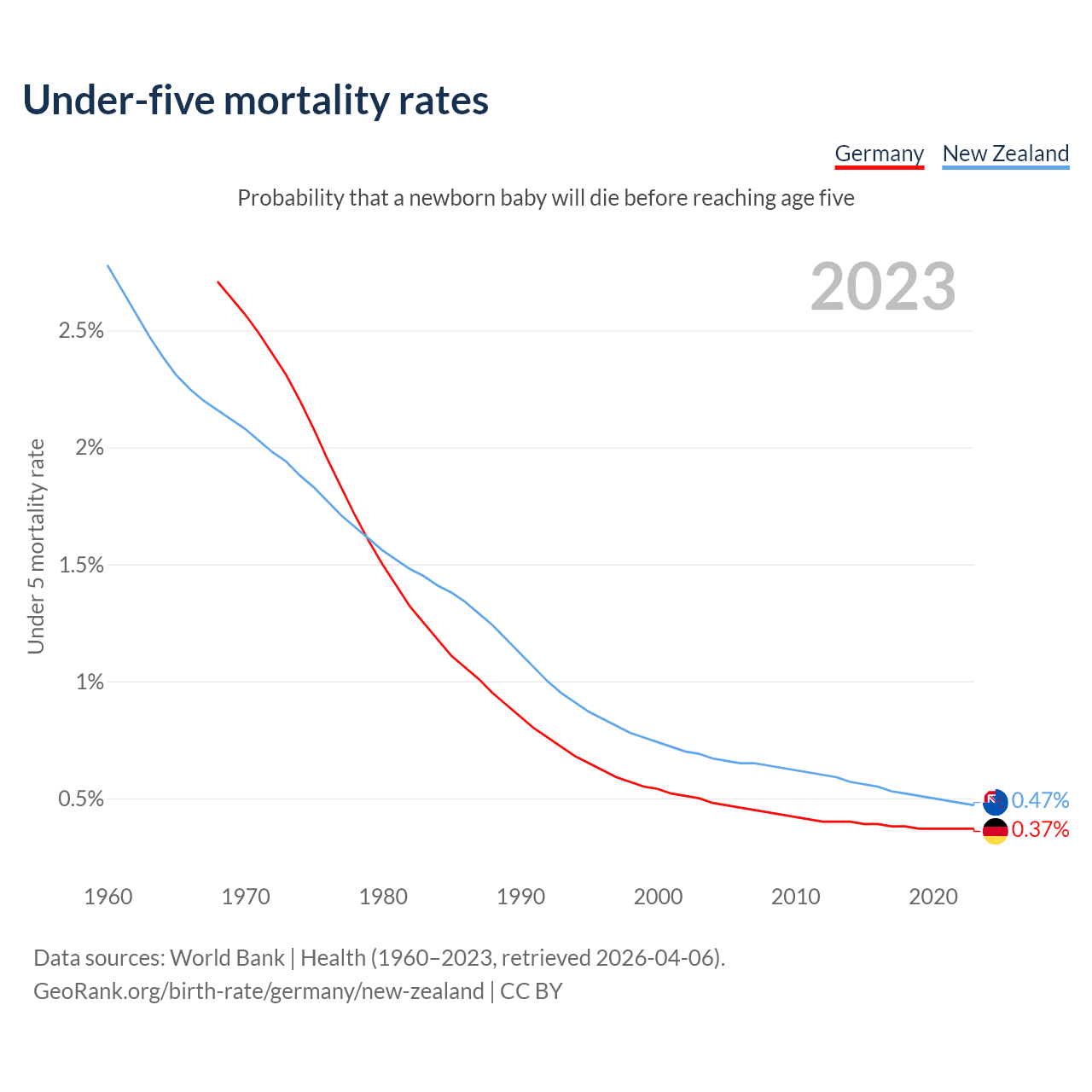 The chance that a newborn baby will die before reaching age five is 0.37% in Germany and 0.47% in New Zealand. Above is a chart with historical data on under-five mortality rates.