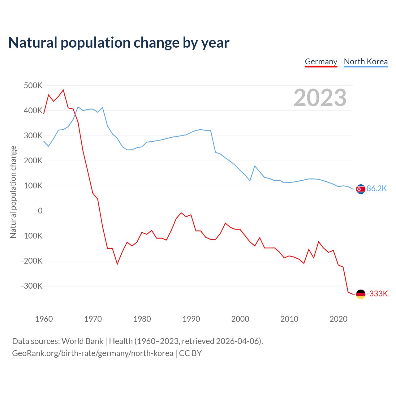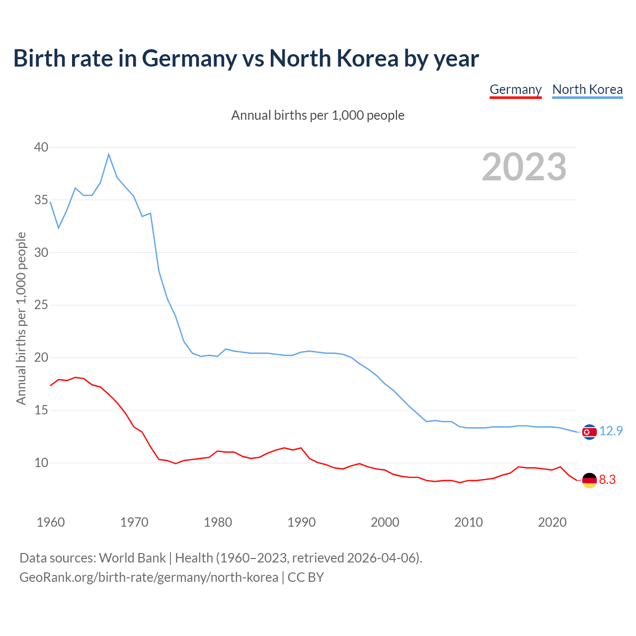 Germany has an annual birth rate of 8.3 births per 1,000 people, compared to 12.9 for North Korea. The average number of children a woman is expected to have during her lifetime — the fertility rate, is 1.39 in Germany and 1.78 in North Korea — 28.1% difference.