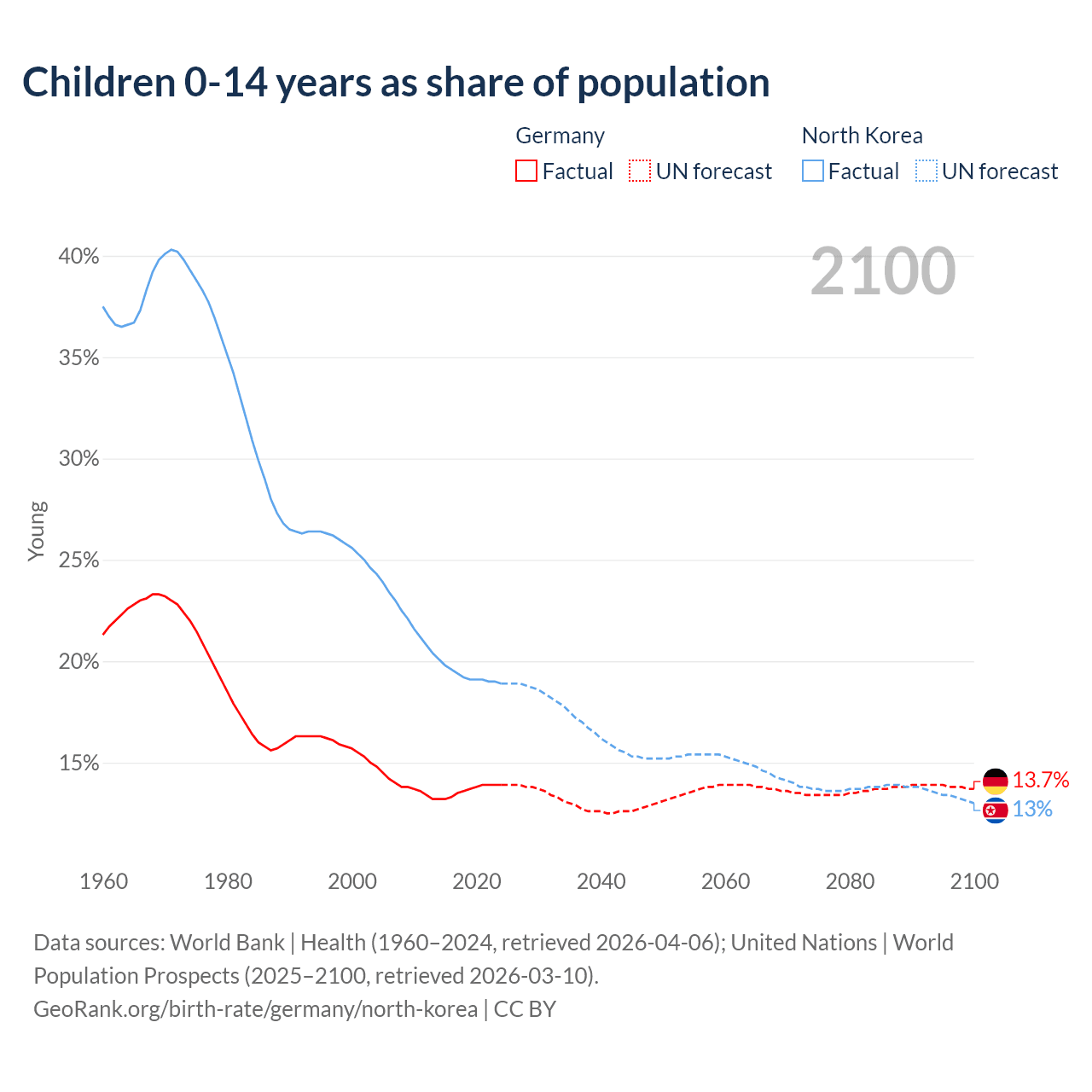 According to the latest available data on birth rates, the fertility rate in Germany was 1.39 children per woman in 2023, compared to 1.78 in North Korea in 2023. The replacement level is considered to be 2.1 children per woman.
