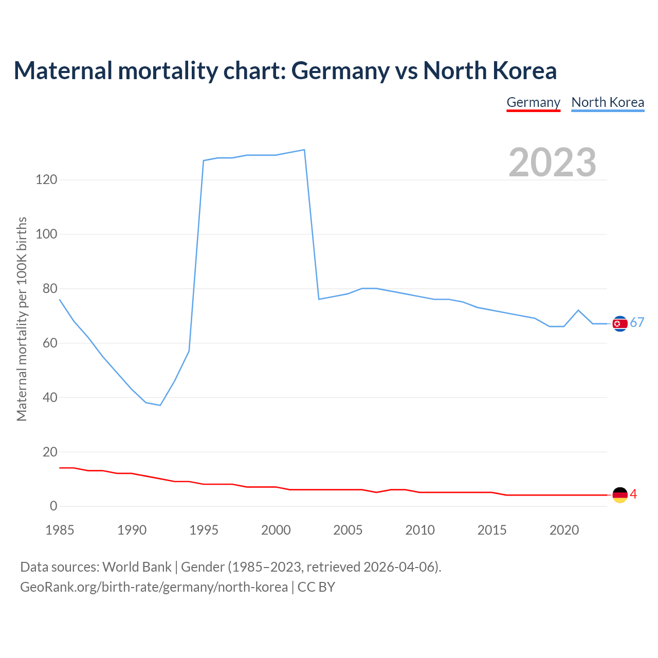 The maternal mortality rate, which is the probability of dying during childbirth or within 42 days of pregnancy termination, is 4 deaths per 100,000 live births in Germany, compared to 67 deaths in North Korea.