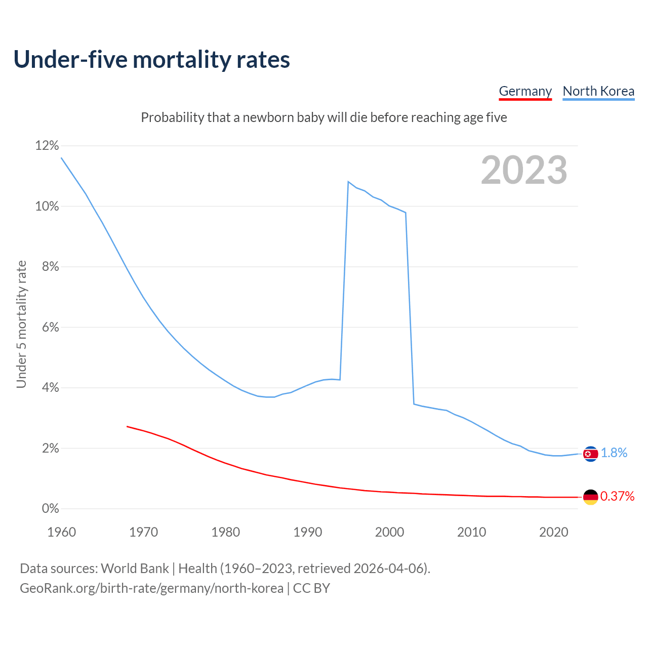 The chance that a newborn baby will die before reaching age five is 0.37% in Germany and 1.8% in North Korea. Above is a chart with historical data on under-five mortality rates.