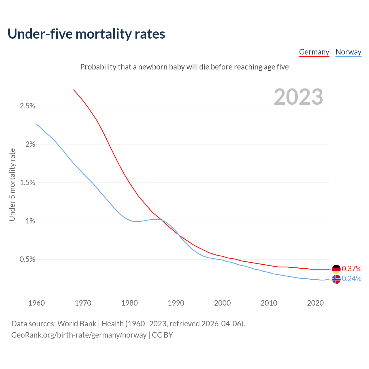 The chance that a newborn baby will die before reaching age five is 0.37% in Germany and 0.24% in Norway. Above is a chart with historical data on under-five mortality rates.