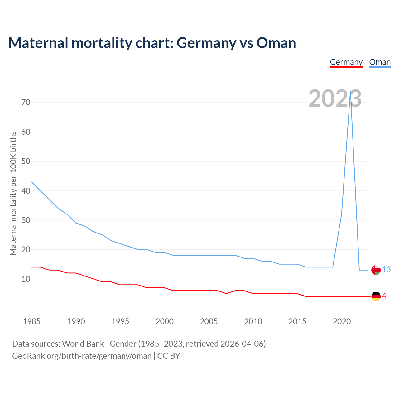 The maternal mortality rate, which is the probability of dying during childbirth or within 42 days of pregnancy termination, is 4 deaths per 100,000 live births in Germany, compared to 13 deaths in Oman.