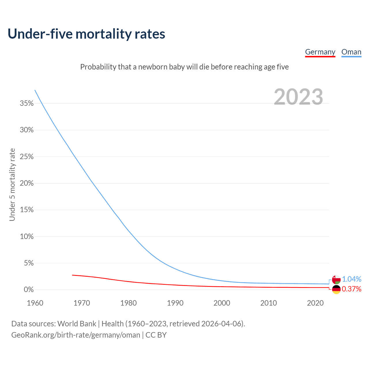 The chance that a newborn baby will die before reaching age five is 0.37% in Germany and 1.04% in Oman. Above is a chart with historical data on under-five mortality rates.
