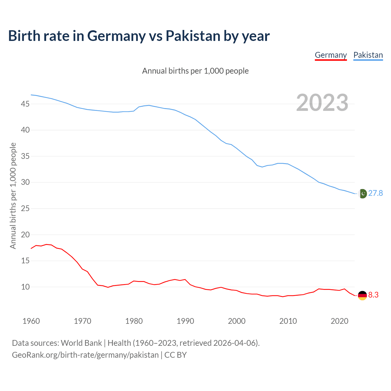 According to the latest available data on birth rates, the fertility rate in Germany was 1.39 children per woman in 2023, compared to 3.61 in Pakistan in 2023. The replacement level is considered to be 2.1 children per woman.