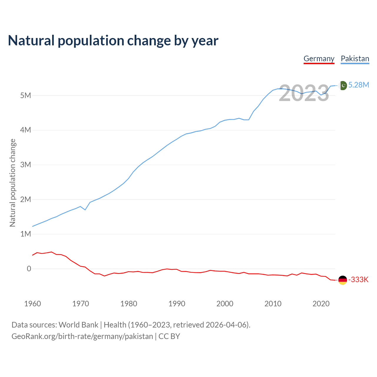 Germany has an annual birth rate of 8.3 births per 1,000 people, compared to 27.8 for Pakistan. The average number of children a woman is expected to have during her lifetime — the fertility rate, is 1.39 in Germany and 3.61 in Pakistan — 159.4% difference.