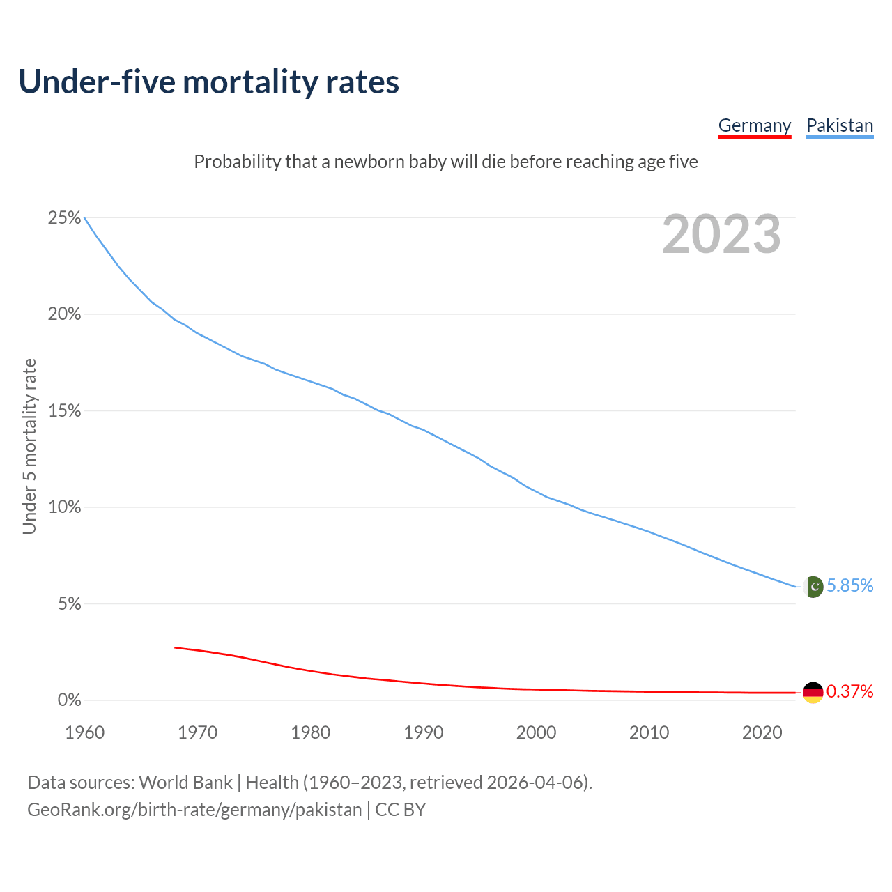 The chance that a newborn baby will die before reaching age five is 0.37% in Germany and 5.85% in Pakistan. Above is a chart with historical data on under-five mortality rates.