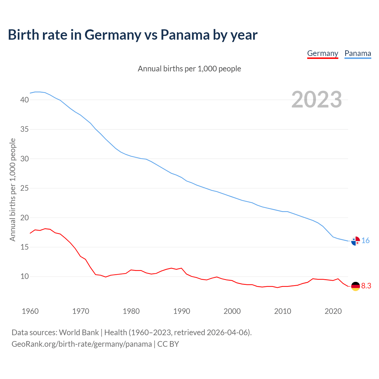 Germany has an annual birth rate of 8.3 births per 1,000 people, compared to 16 for Panama. The average number of children a woman is expected to have during her lifetime — the fertility rate, is 1.39 in Germany and 2.12 in Panama — 52.4% difference.