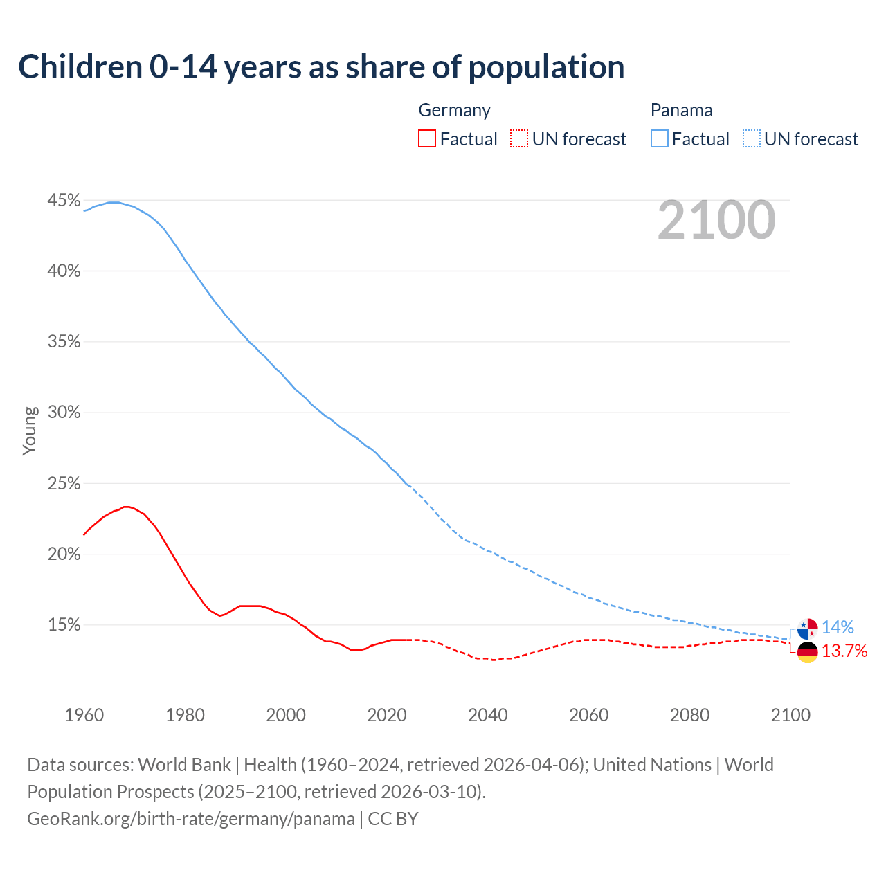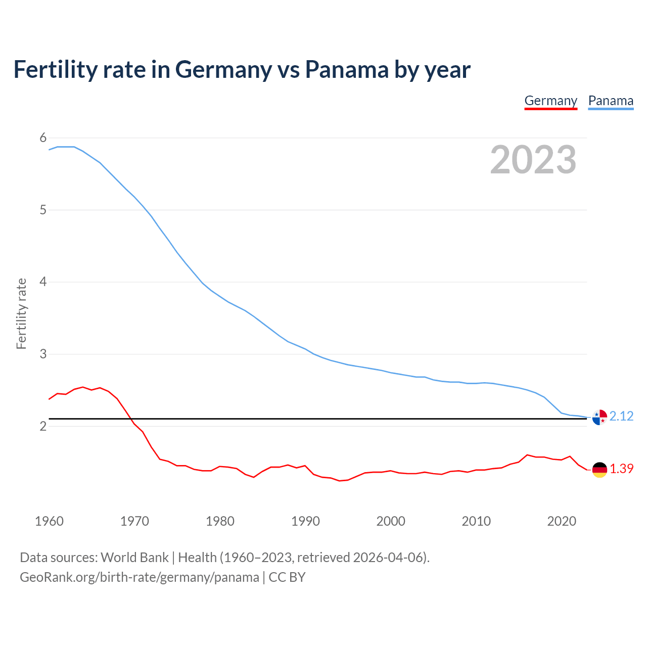 According to the latest available data on birth rates, the fertility rate in Germany was 1.39 children per woman in 2023, compared to 2.12 in Panama in 2023. The replacement level is considered to be 2.1 children per woman.