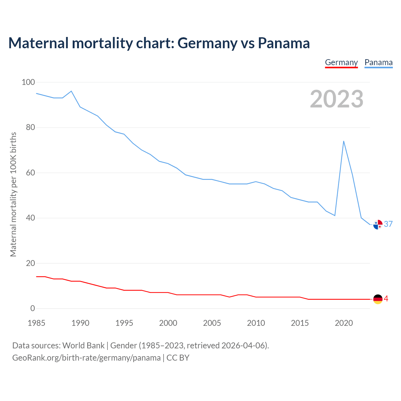 The maternal mortality rate, which is the probability of dying during childbirth or within 42 days of pregnancy termination, is 4 deaths per 100,000 live births in Germany, compared to 37 deaths in Panama.