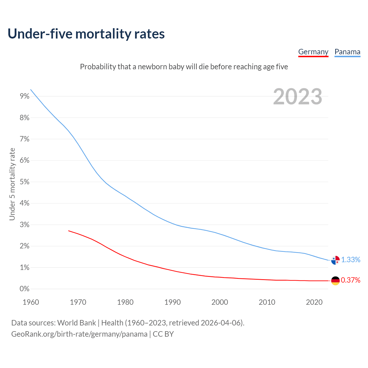 The chance that a newborn baby will die before reaching age five is 0.37% in Germany and 1.33% in Panama. Above is a chart with historical data on under-five mortality rates.