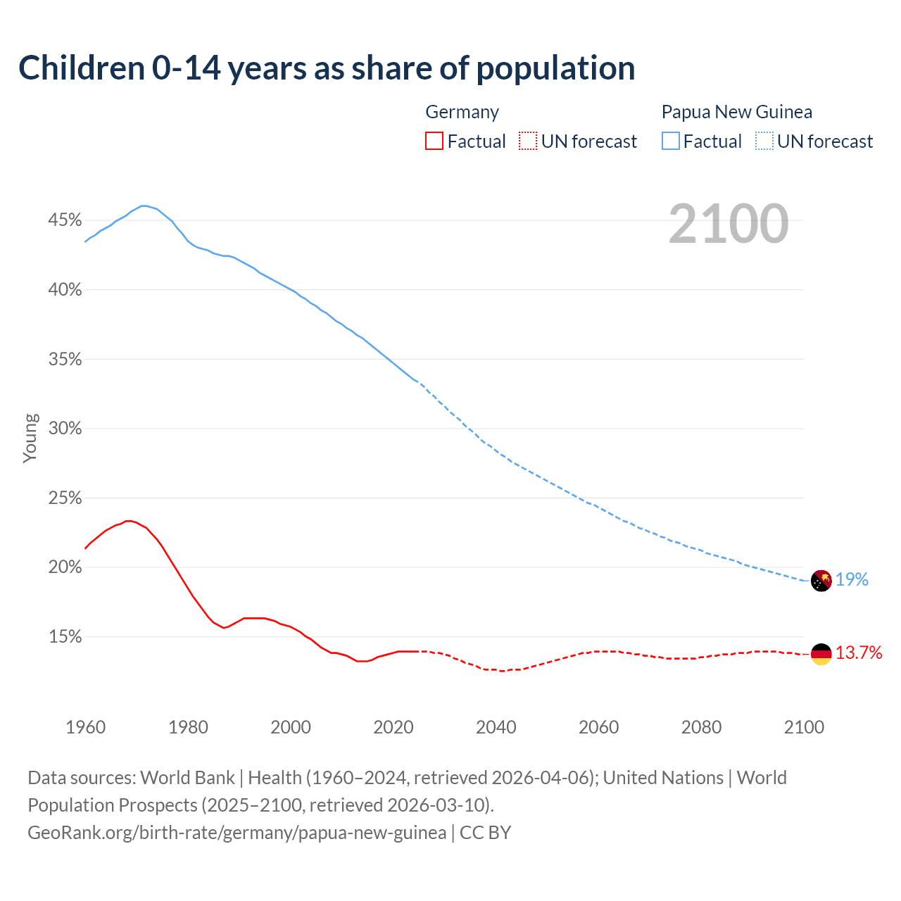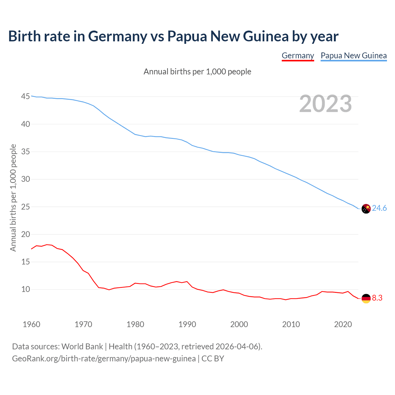 Germany has an annual birth rate of 8.3 births per 1,000 people, compared to 24.6 for Papua New Guinea. The average number of children a woman is expected to have during her lifetime — the fertility rate, is 1.39 in Germany and 3.1 in Papua New Guinea — 122.9% difference.