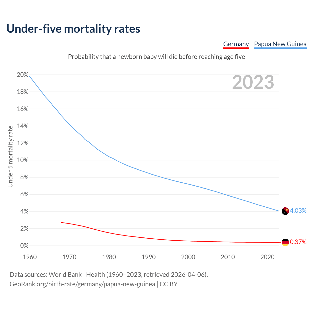 The chance that a newborn baby will die before reaching age five is 0.37% in Germany and 4.03% in Papua New Guinea. Above is a chart with historical data on under-five mortality rates.
