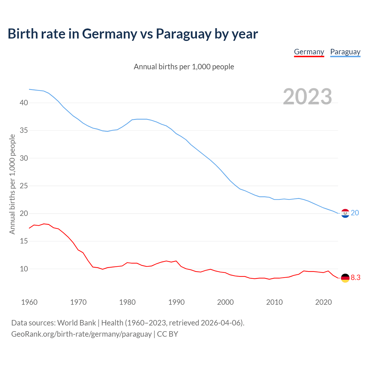 According to the latest available data on birth rates, the fertility rate in Germany was 1.39 children per woman in 2023, compared to 2.42 in Paraguay in 2023. The replacement level is considered to be 2.1 children per woman.