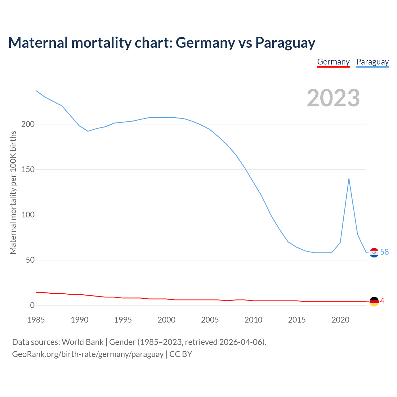 The maternal mortality rate, which is the probability of dying during childbirth or within 42 days of pregnancy termination, is 4 deaths per 100,000 live births in Germany, compared to 58 deaths in Paraguay.